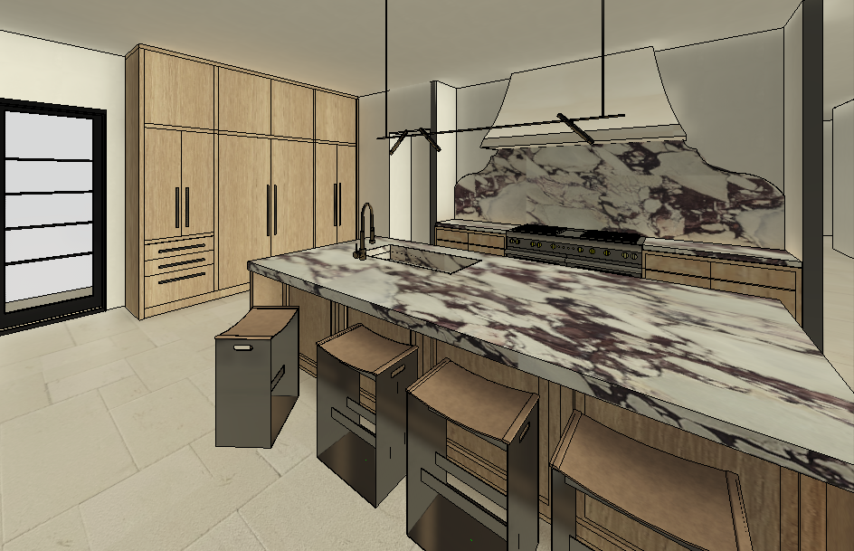 a spanish modern style kitchen with light oak cabinetry light limestone flooring oiled brass faucet and fixtures and crisp ambient lighting
