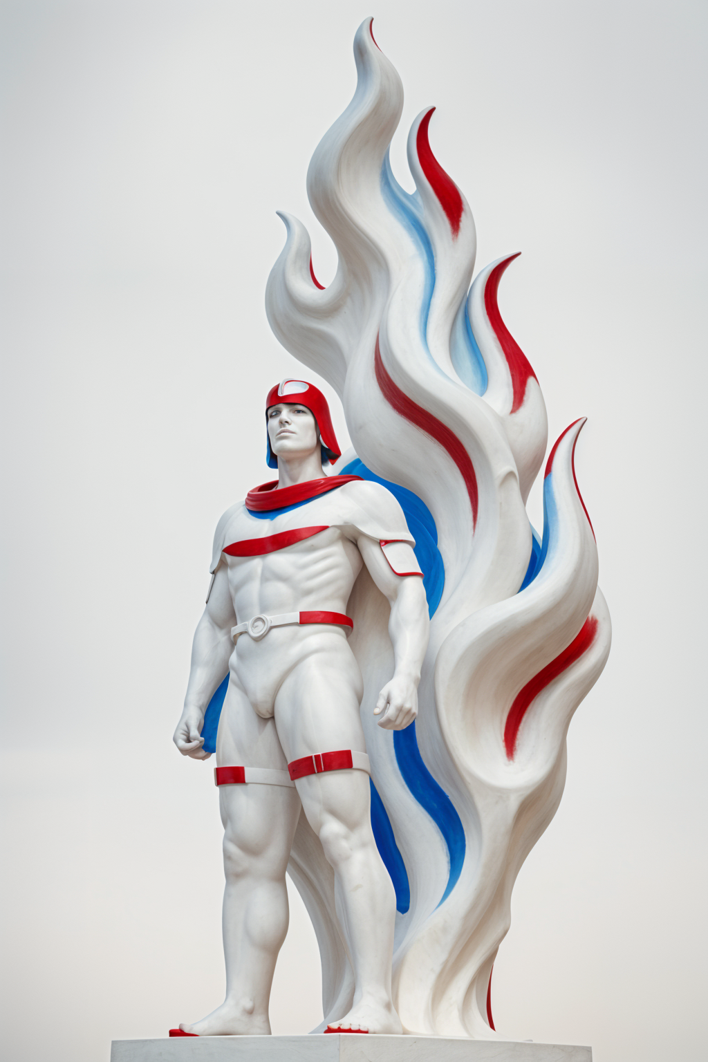bauhaus exterior shot minimalist plastic statue of russian warrior in red and blue colors architecture