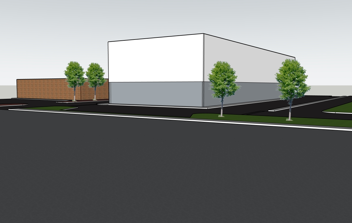 render modern 3 story mixed used building with first floor retail and second and third floor residential use trees in foreground and sunny day