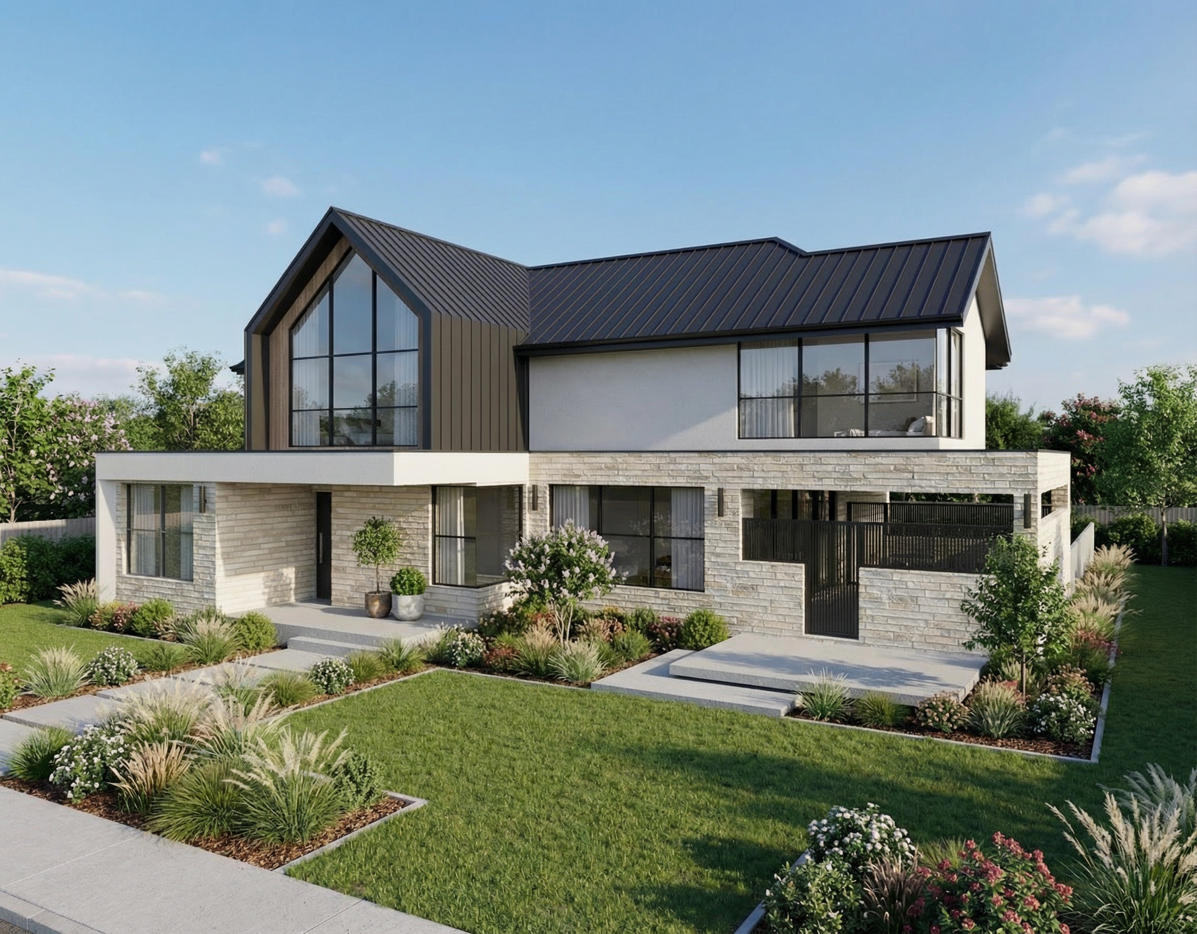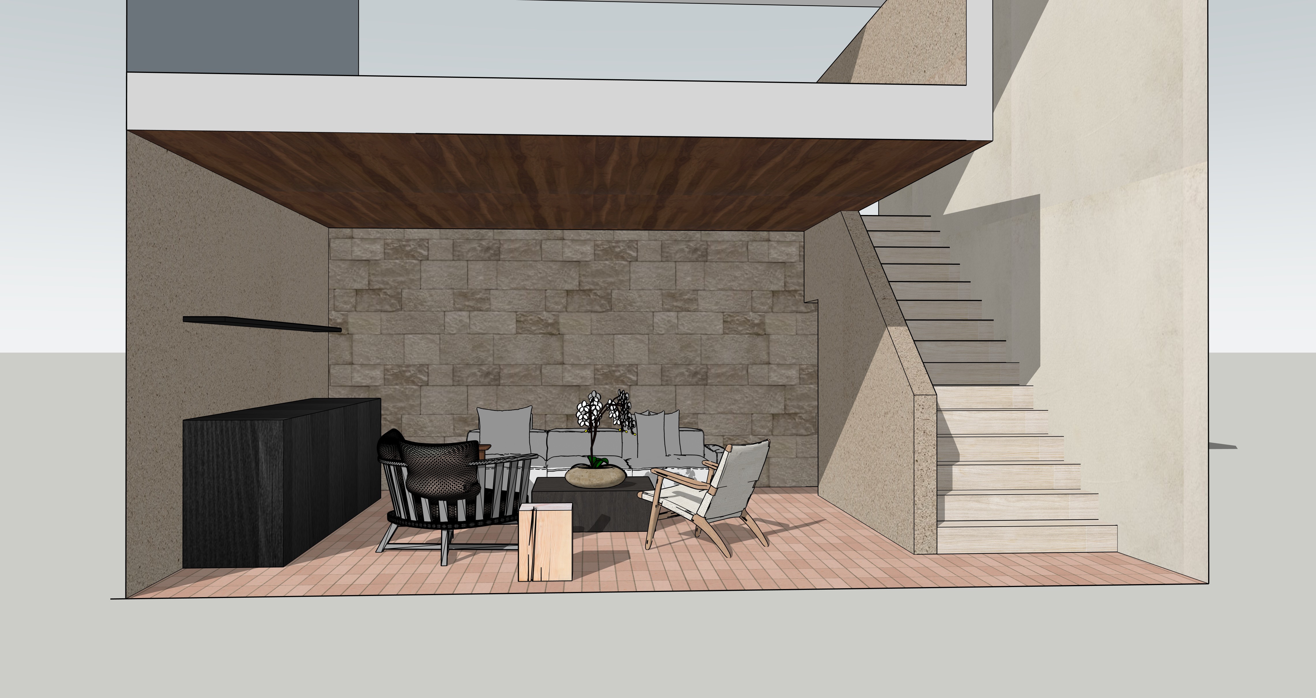 terracotta tiled floor with terracotta stucco to all walls use existing furniture as base point and add natural fabrics in warm greys ecru and olive soft tones similar to norm architects natural light as per sketch from front add black track lighting