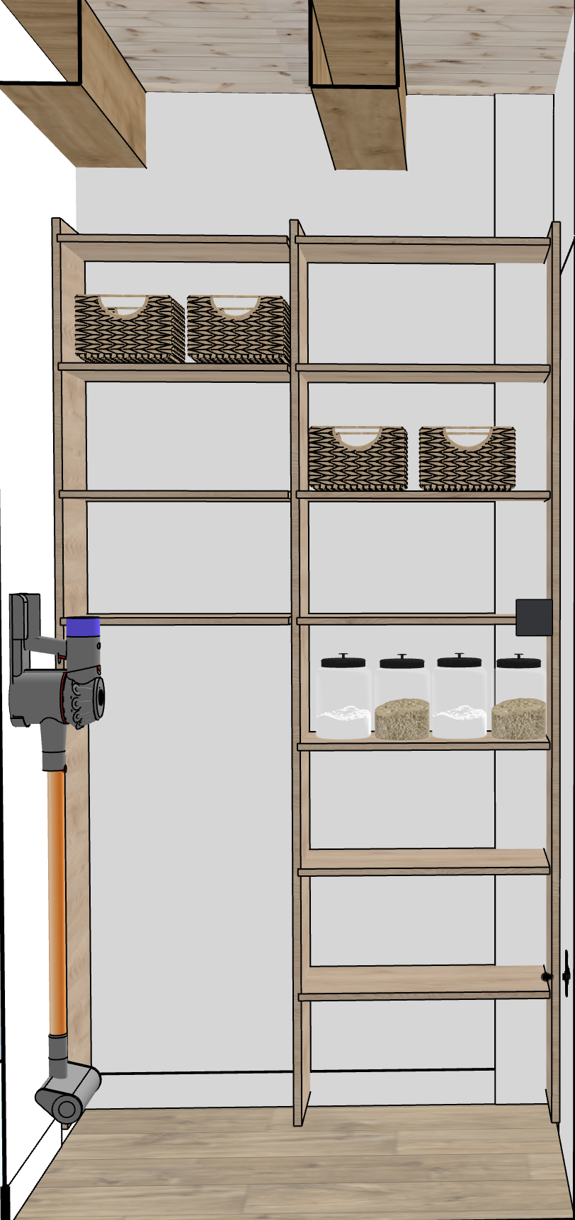 this is a storage compartment for groceries a mop paper the dyson hangs on the left side on the wall