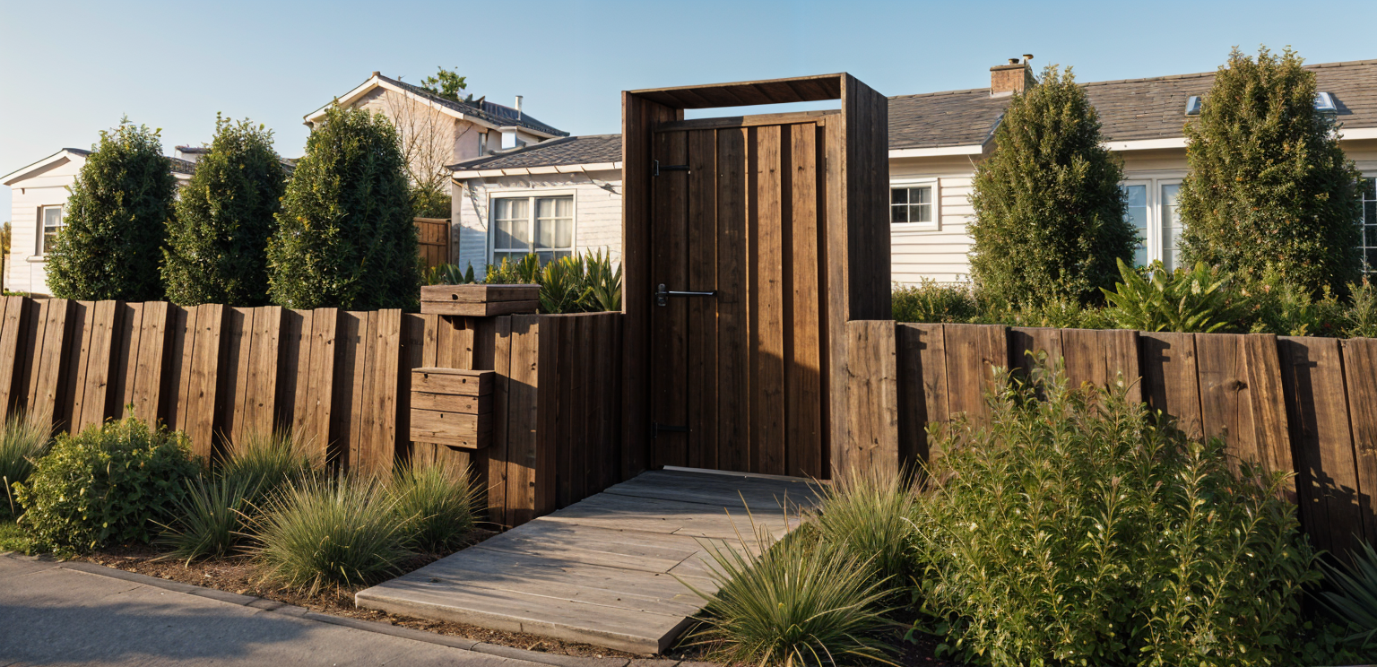lots of lomandra grasses redwood fence modern rusty steel entry gate portal surround around modern redwood gate to match more tall full bushy hedges modern rusty steel mail box modern rusty steel portal around the redwood gate blue stone pavers