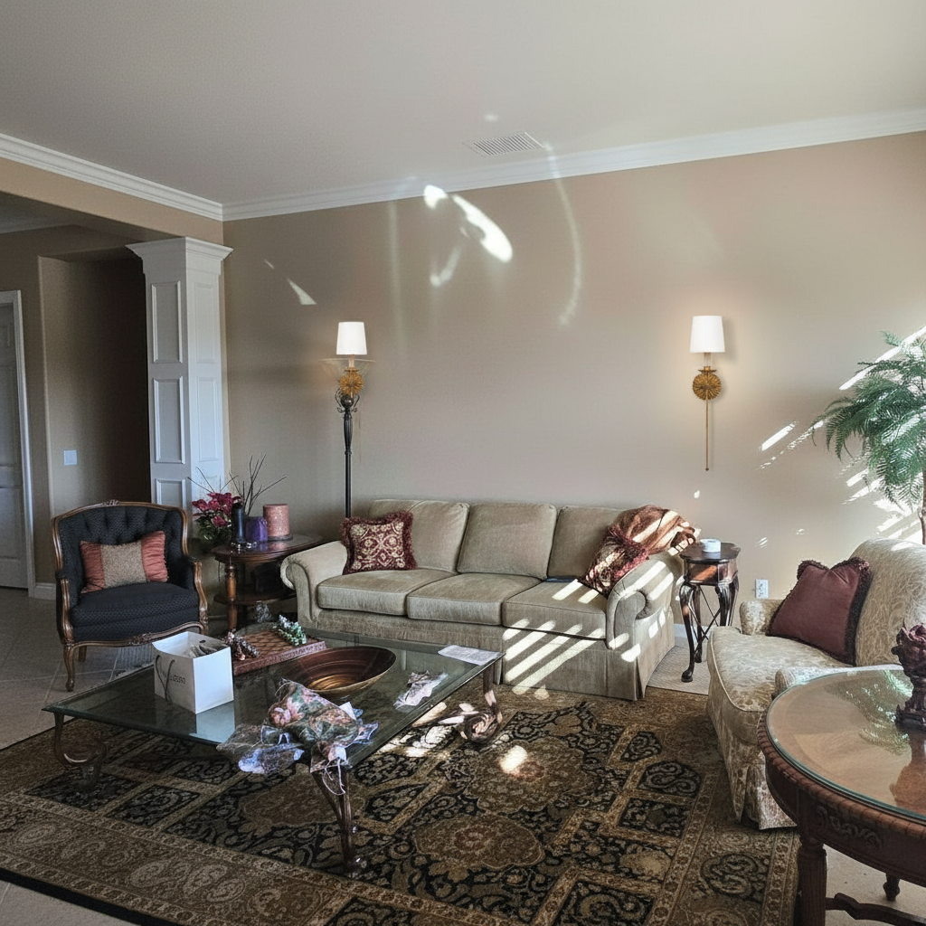 do not change the cabinets in any way preserve the exact cabinet colors materials finishes dimensions door and drawer styles hardware spacing alignment and all geometry exactly as shown do not alter the countertop shape backsplash appliances flooring lighting fixtures or wall structure only remove the construction materials clutter and mess from the scene clean the room and make it look finished and staged add a few simple tasteful home accessories appropriate for the style of the space but do not add or remove any furniture windows or architectural elements maintain the original lighting direction and realism enhance clarity and polish the photo while keeping the cabinetry and room design completely unchanged do not alter the lighting to keep the cabinet colors as they are in the image add new flooring add a faucet to the sink add undercabinet lighting put a dishwasher in the opening on the right put a undercounter fridge in the opening on the left stage for a wet bar