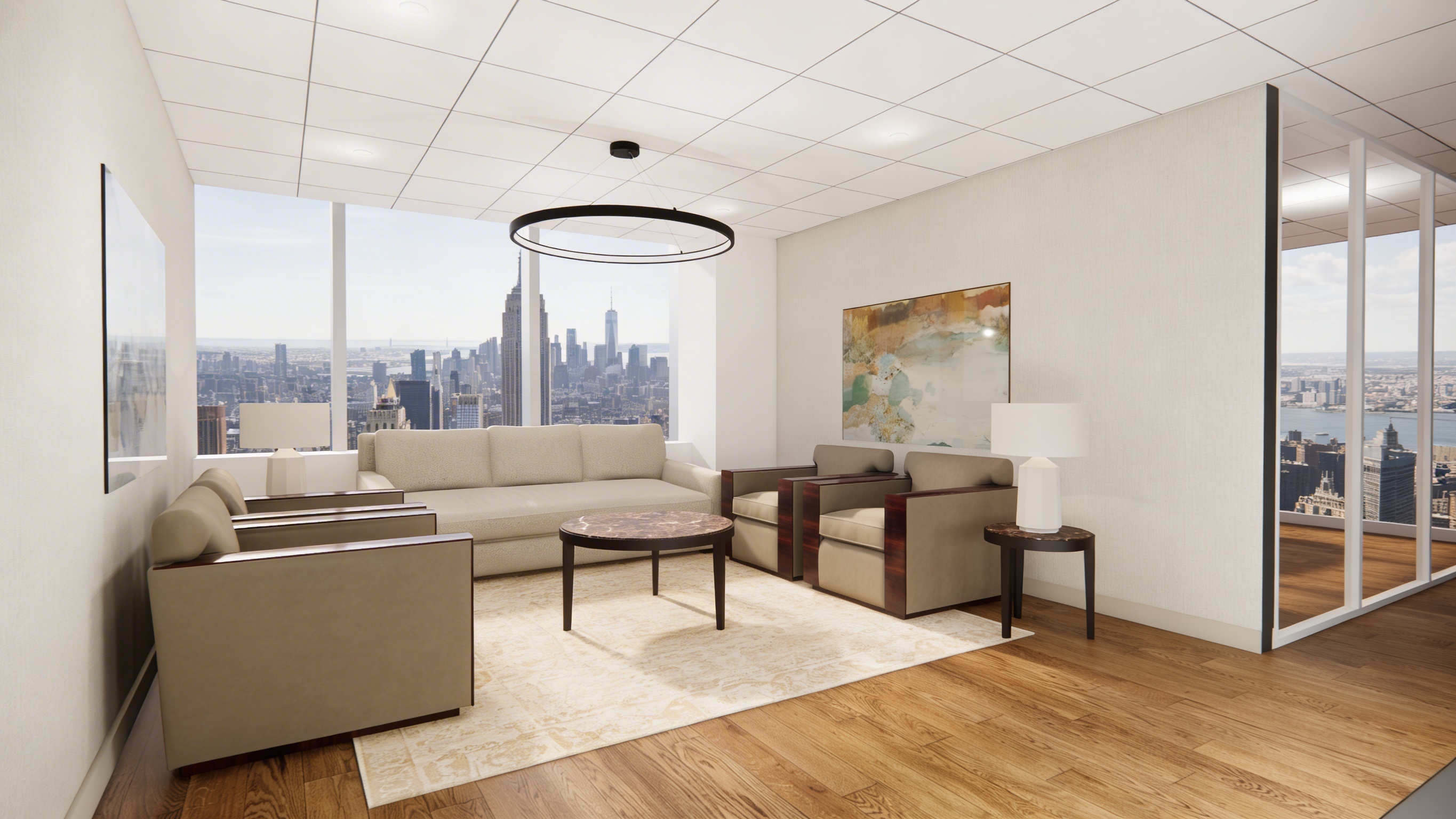 create a realistic cozy suburban house scene with a two story house featuring a light gray exterior with crisp white trim the front door is black adding an inviting touch all windows are framed with black shutters and a subtle grid pattern at the windows the roof is a gentle black shingle contrasting harmoniously with the rest of the facade surround the house with a tranquil lush green lawn under a crisp clear blue sky casting soft natural shadows to enhance the serene atmosphere add trees in the background no garage door but three tall casement windows create a sunroom on the left where a garage door is shown brick is painted light gray add sidewalk to concrete stoop add a tall potted plant to the right of the front door