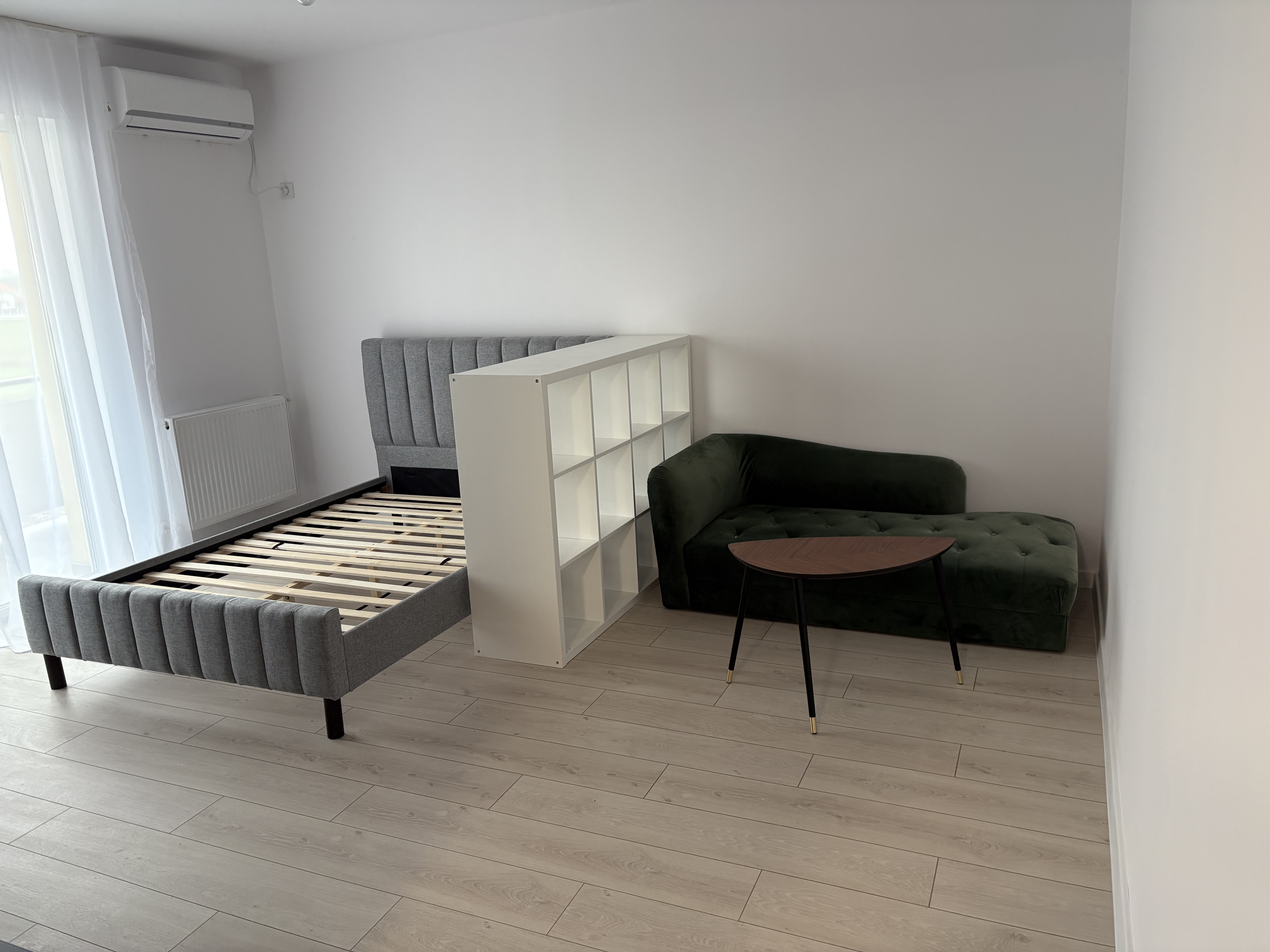 add art decoration above the green couch and add also a modern floor lamp near it add seating near the table