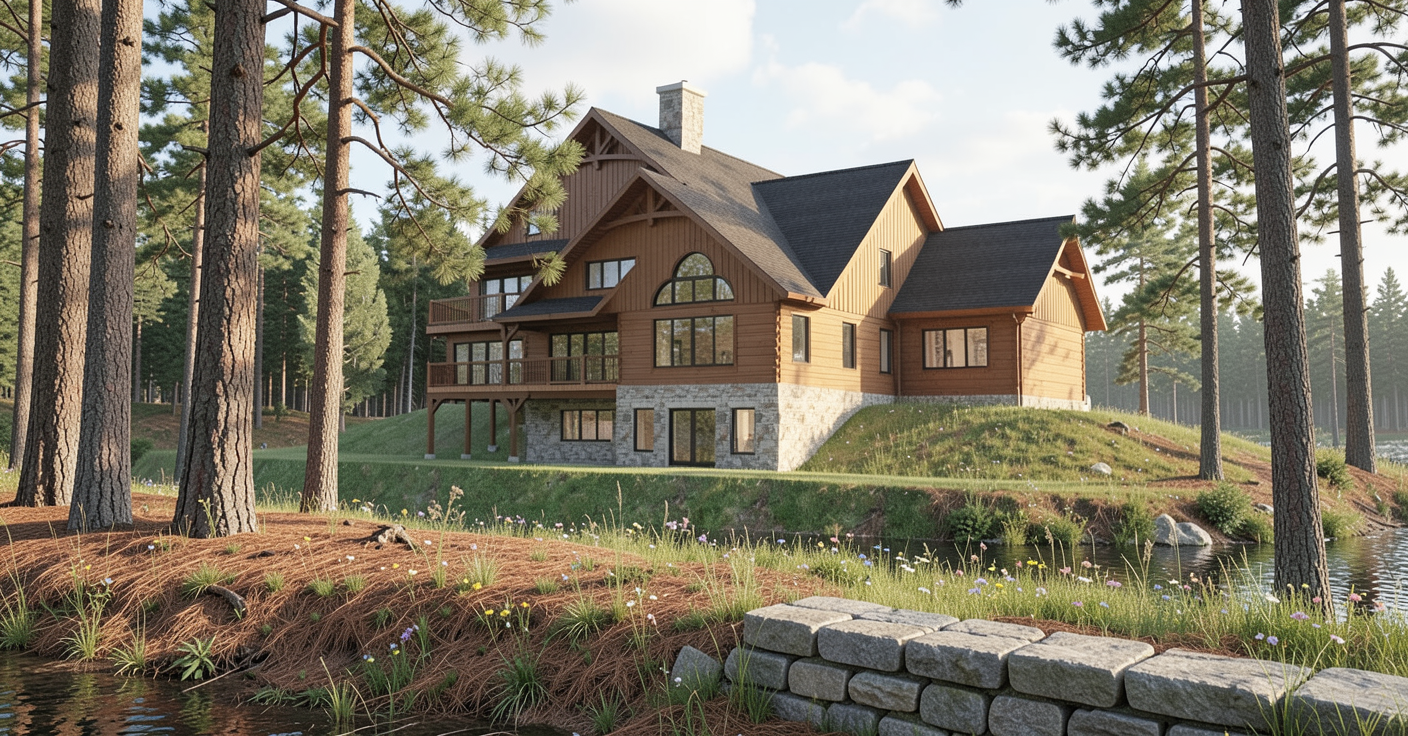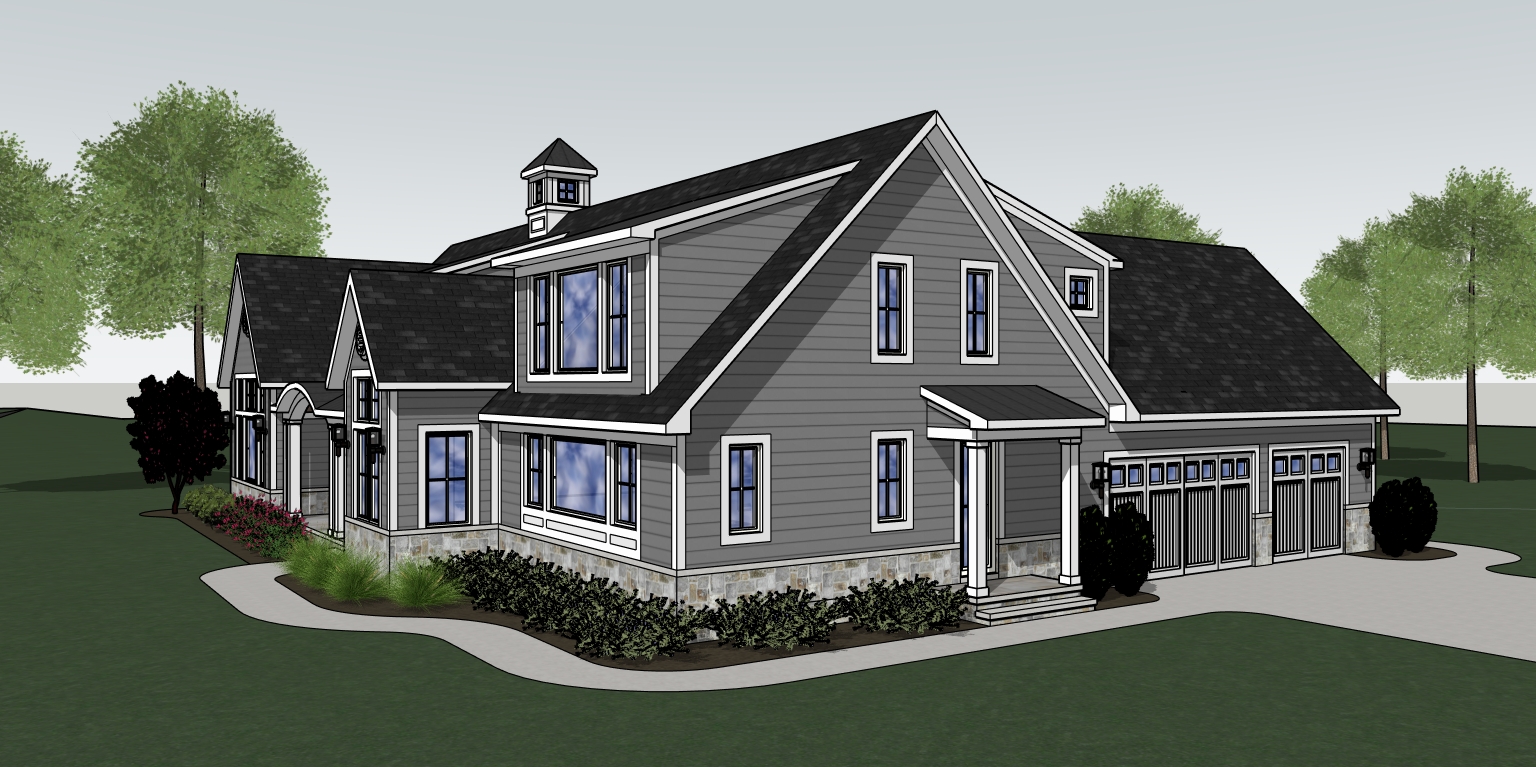 partly cloudy day some deciduous trees behind the house water is reflected in glass windows 2 chairs and a side table on the porch gray siding white trim white windows add landscaping