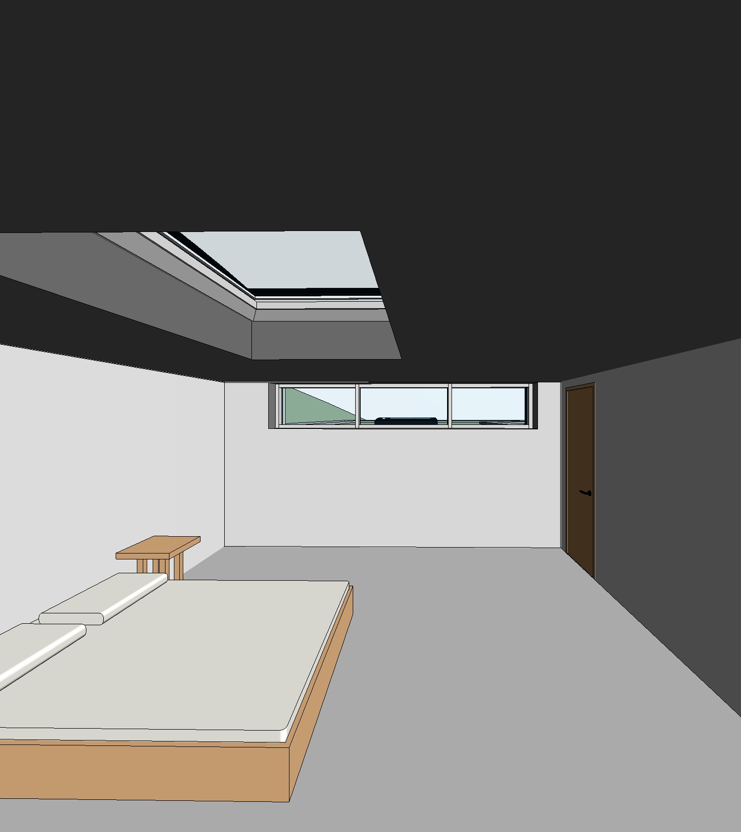 strictly preserve all existing geometry from the input image 2d linework do not alter wall positions room proportions ceiling height window size window position or door locations do not add remove widen narrow or reposition any openings treat the input as authoritative architectural geometry generate a photorealistic contemporary bedroom interior by applying materials furniture and lighting only without modifying geometry camera view use the exact camera position and orientation from the input image no change to field of view or framing bedroom interior material application only cream painted walls applied to existing wall geometry only kersaint cobb wool carpet applied to existing floor geometry modern bed with egyptian cotton bedding scaled to fit the existing room without pushing walls or openings window do not modify retain the exact size height and proportions of the existing narrow high level window apply modern detailing only no enlargement reshaping or repositioning furniture placement rules modern oak dressing table placed directly below the existing window respecting clearances typical bedroom furniture arranged conservatively within available floor area furniture must not intersect walls windows or doors view beyond the window depth only exterior geometry remains unchanged through the window show the top of a sedum roof in the foreground beyond the roof a distant landscape valley exterior elements must align with the existing window opening additional elements landscape paintings scaled to existing wall areas shelving units placed only where space already exists oak internal door using the existing door opening exactly as provided lighting mood natural daylight entering only through the existing window soft neutral interior lighting no added light sources that imply new openings quality style photorealistic architectural visualisation contemporary understated residential design accurate scale and proportions change nothing structurally no reinterpretation of plan no new openings no resized windows no shifted walls no ceiling changes no added architectural elements no perspective warping