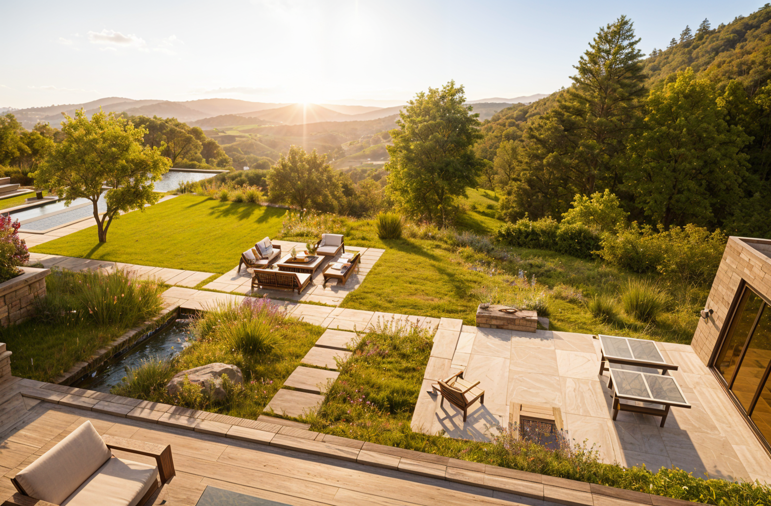 add wood decking at ping pong more flowers and keep rectilinear shape of lawn keep lighting as is