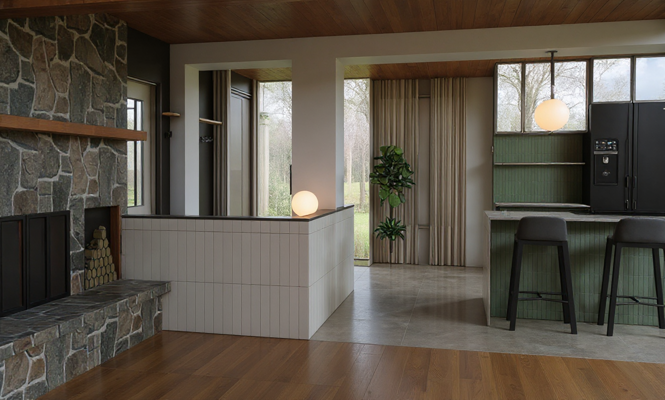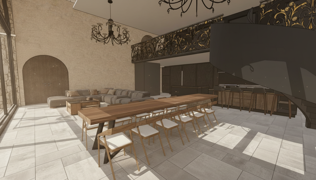 exterior shot render a luxurious modern interior space with high ceilings featuring a grand spiral staircase in charcoal black include elegant black chandeliers hanging from the ceiling casting intricate shadows design the walls with a textured beige stone finish and integrate large arched wooden doors in a dark oak hue in the foreground display a long wooden dining table with natural brown tones surrounded by chairs featuring light gray cushions add a cozy dark gray leather sectional sofa and a matching wooden coffee table the flooring should be stone light texture reflecting the ambient light to create a warm and inviting atmosphere finally incorporate a balustrade with ornate black and gold wrought iron de