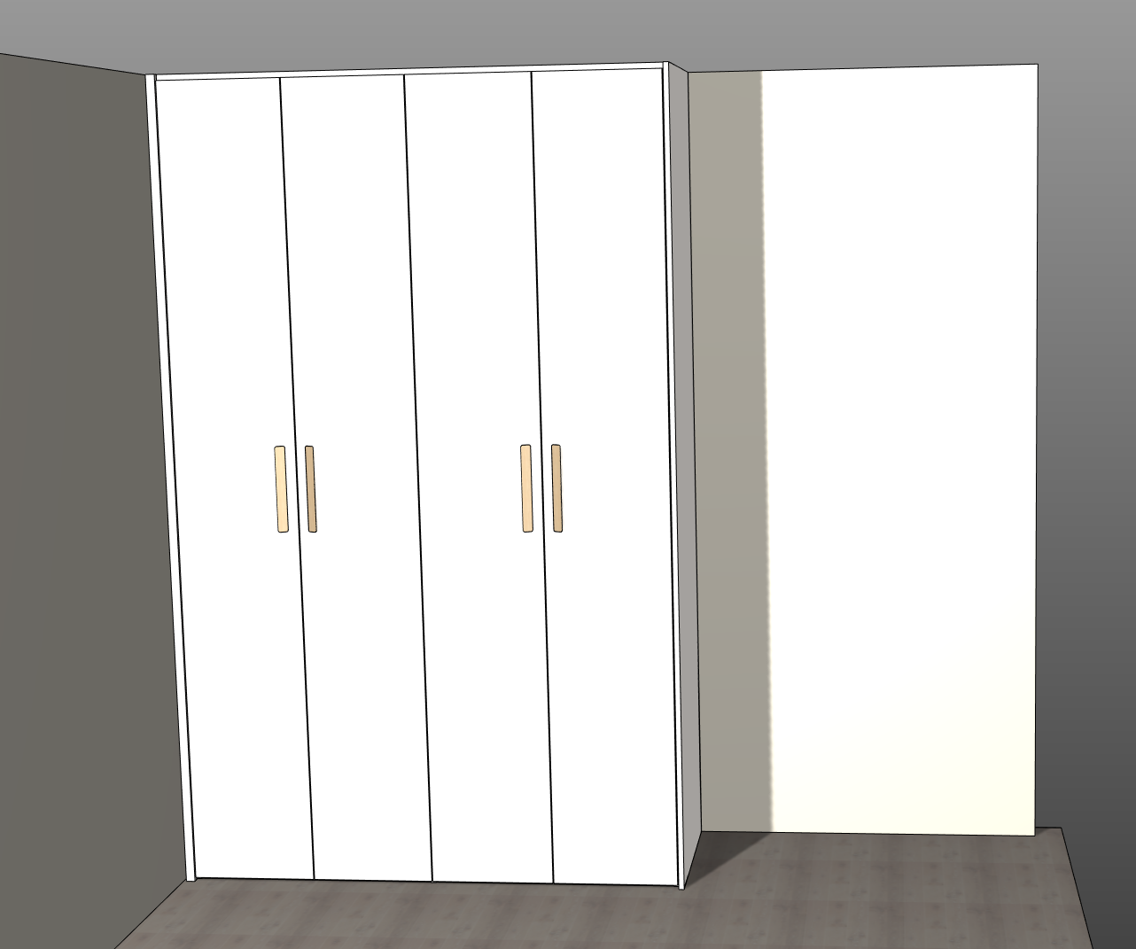 render a minimalist white wardrobe with sleek wooden handles in a modern room the wardrobe doors are pure white reflecting a soft sheen the handles are a light oak contrasting subtly against the white the surrounding walls feature a neutral gray tone creating a calming and sophisticated atmosphere the floor is a textured dark wood adding warmth to the scene the ambiance is serene and contemporary with soft diffused lighting enhancing the overall elegance also add some room decorations or other furniture