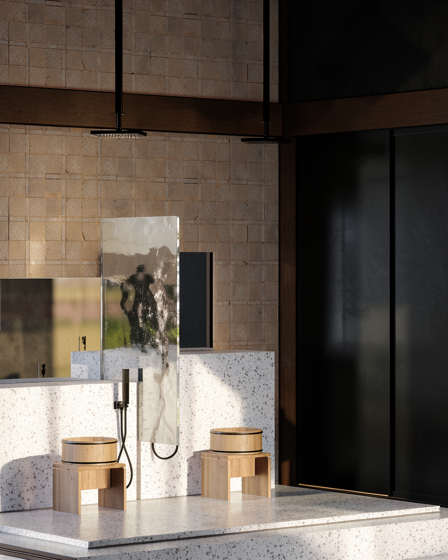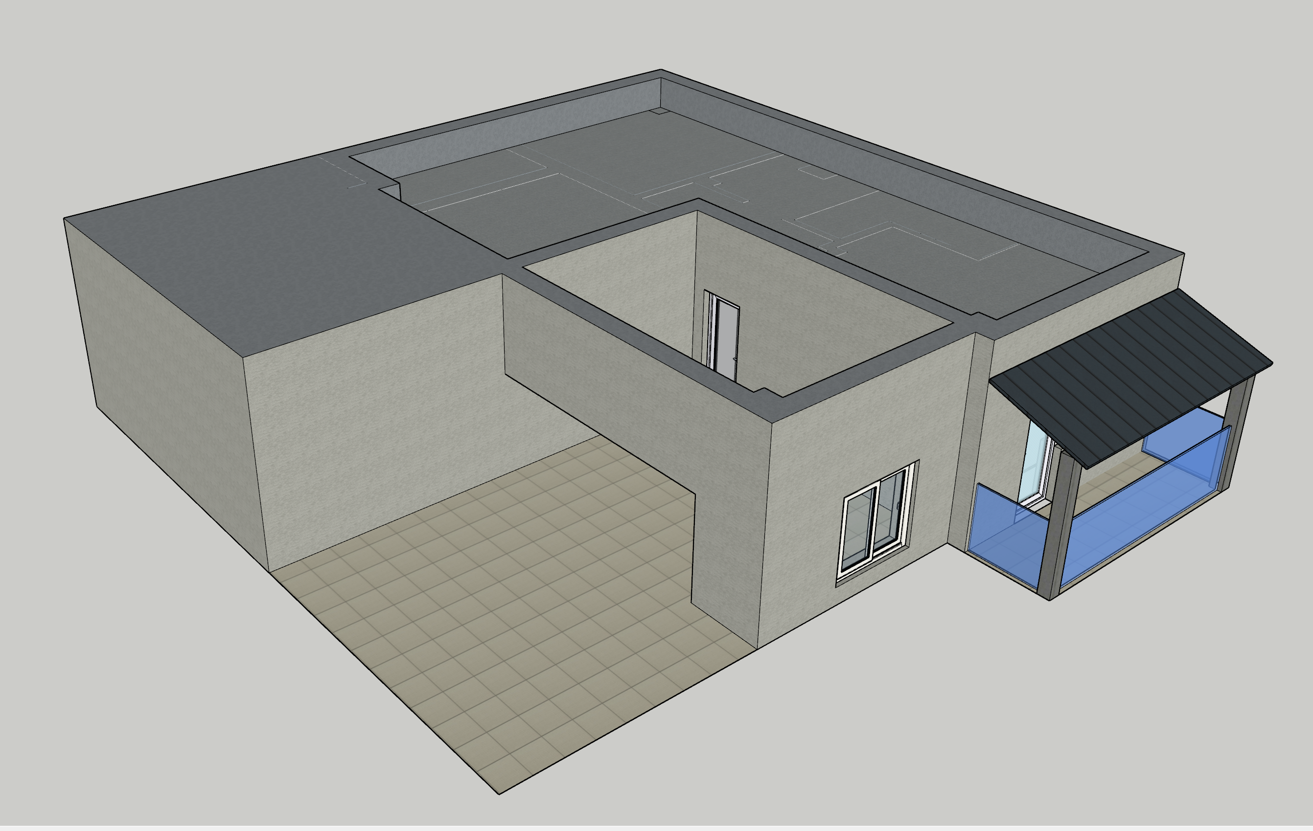 create a photorealistic v ray style daytime exterior render based exactly on the provided 3d model image important geometry rule do not invent extend enlarge or add any terrace balcony slab roof edge parapet floor platform or building volume outside the exact limits shown in the reference drawing the outer limit of the block is exactly the outer limit visible in the model do not add any extra perimeter terrace in front on the right side or anywhere else keep the footprint proportions wall positions terrace edges roof edges and all built elements exactly as in the reference rendering requirements realistic architectural visualization natural daylight soft small shadows clean sky believable materials v ray quality subtle ambient occlusion realistic reflections on glass slightly warm daylight not dramatic not sunset natural exposure not overbright realistic camera perspective similar to the reference view model preservation preserve the exact shape of the apartment preserve the exact terrace dimensions shown in the model preserve the exact covered balcony canopy area on the right side only if it exists in the reference preserve the exact parapet and flat roof geometry preserve window and door positions exactly as shown do not redesign architecture do not change wall thicknesses do not add floors neighboring slab extensions or invented rooftop surfaces materials light beige or off white exterior plaster dark grey flat roof membrane light neutral ceramic tiles on the terrace floor dark anthracite metal canopy realistic blue tinted glass railing subtle concrete texture where visible environment apartment is located on the 4th floor of a 4 storey block show only realistic surrounding urban context in the distance no exaggerated terraces around the apartment no luxury villa look no oversized rooftop platform lighting daytime around late morning or early afternoon soft direct sunlight small realistic shadows natural global illumination output style ultra realistic architectural render high detail clean composition realistic v ray render no fantasy elements no added decorative objects unless minimal and believable negative prompt do not enlarge the terrace do not add extra balcony area do not create slab extensions do not change the building footprint do not invent architecture do not add extra roof platforms do not add pergolas do not add furniture do not add plants do not add people do not make it cinematic or dramatic do not use sunset lighting do not make it look like a penthouse villa