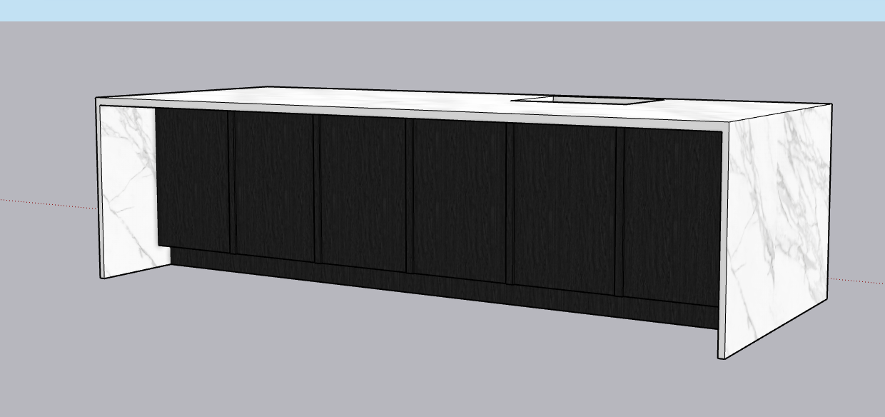 photo realistic kitchen island with waterfall white marble top and black wood