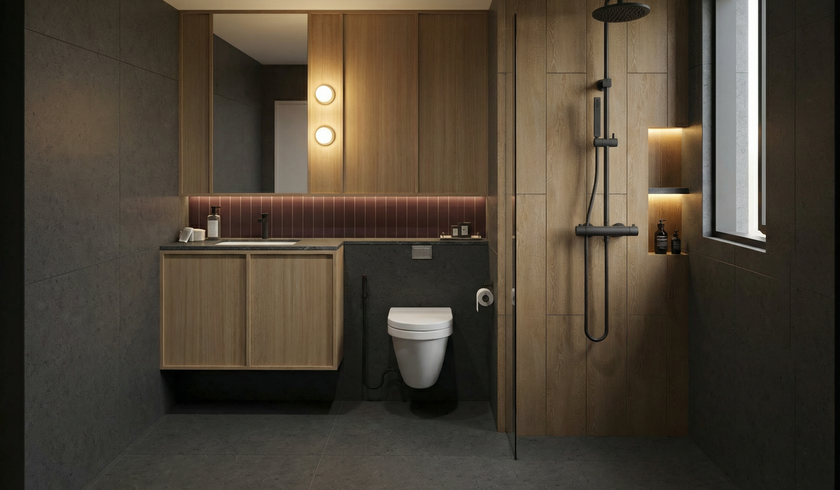 modern cafe interior with minimal flooring and accent tile compositions kilim inspired patterned ceramic tiles placed only in specific zones such as under tables or entrance areas creating a tile rug effect the rest of the floor is plain neutral material led screens behind the counter for menu and prices balanced composition contemporary design with subtle ethnic influence muted color palette sage green cream dusty blue high end realistic 3d render architectural visualization style clean and refined