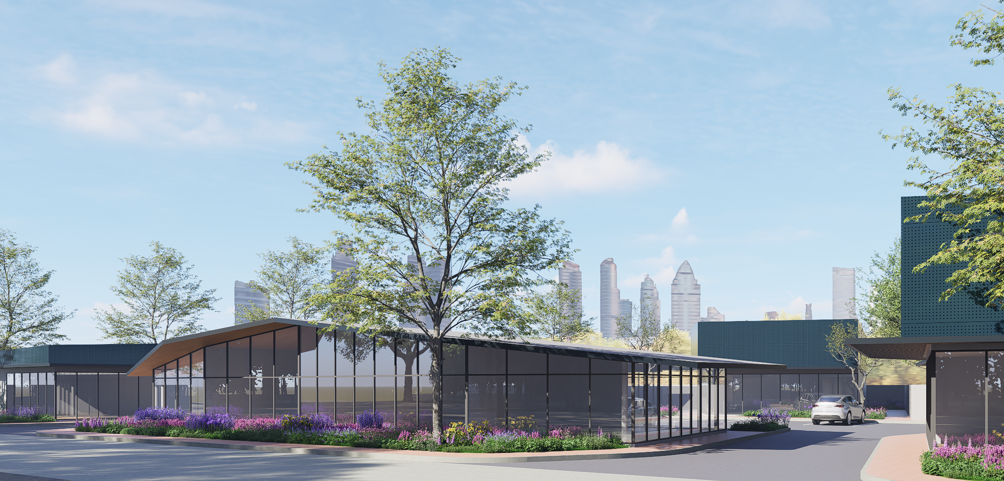 modern urban parking lot scene with sleek cars surrounded by lush green trees and purple flower beds the buildings are a clean slate gray with large glass windows reflecting a clear blue sky the atmosphere is calm and contemporary with a hint of bustling urban life the cars are glossy white and metallic the concrete pavement a soft gray the trees are vibrant green and the flowers add a pop of vibrant purple in the background buildings have a minimalist design with a modern blue facade bright sunlight casts soft shadows across the scene enhancing the vibrant and serene urban atmosphere