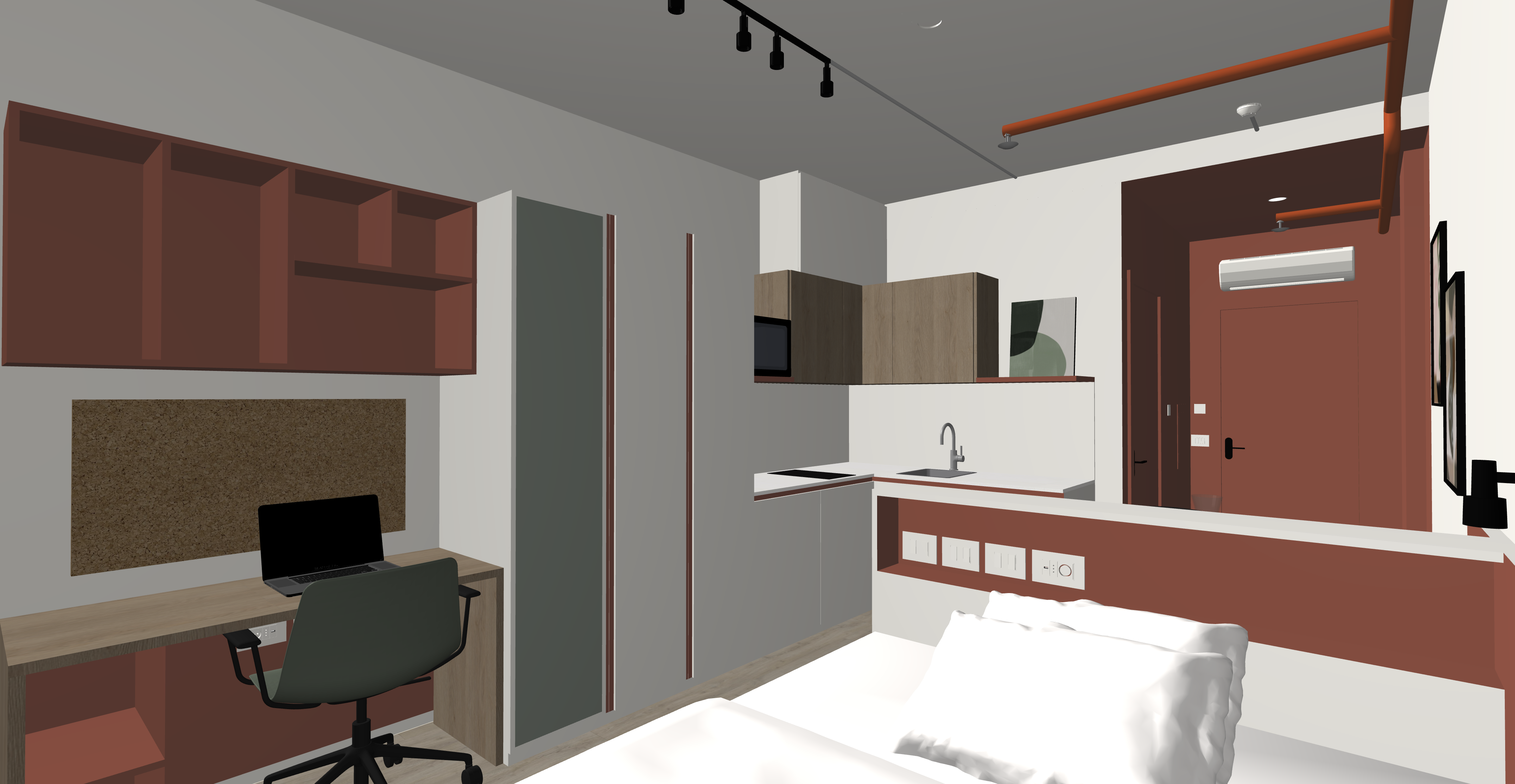 mantieni colori arredi solo la scocca della sedia verde salvia soffitto in cemento grigio chiaro strip led sotto i pensili cucina solo un anta armadio con specchio arreda la stanza come uno studente universitario no poster alle pareti