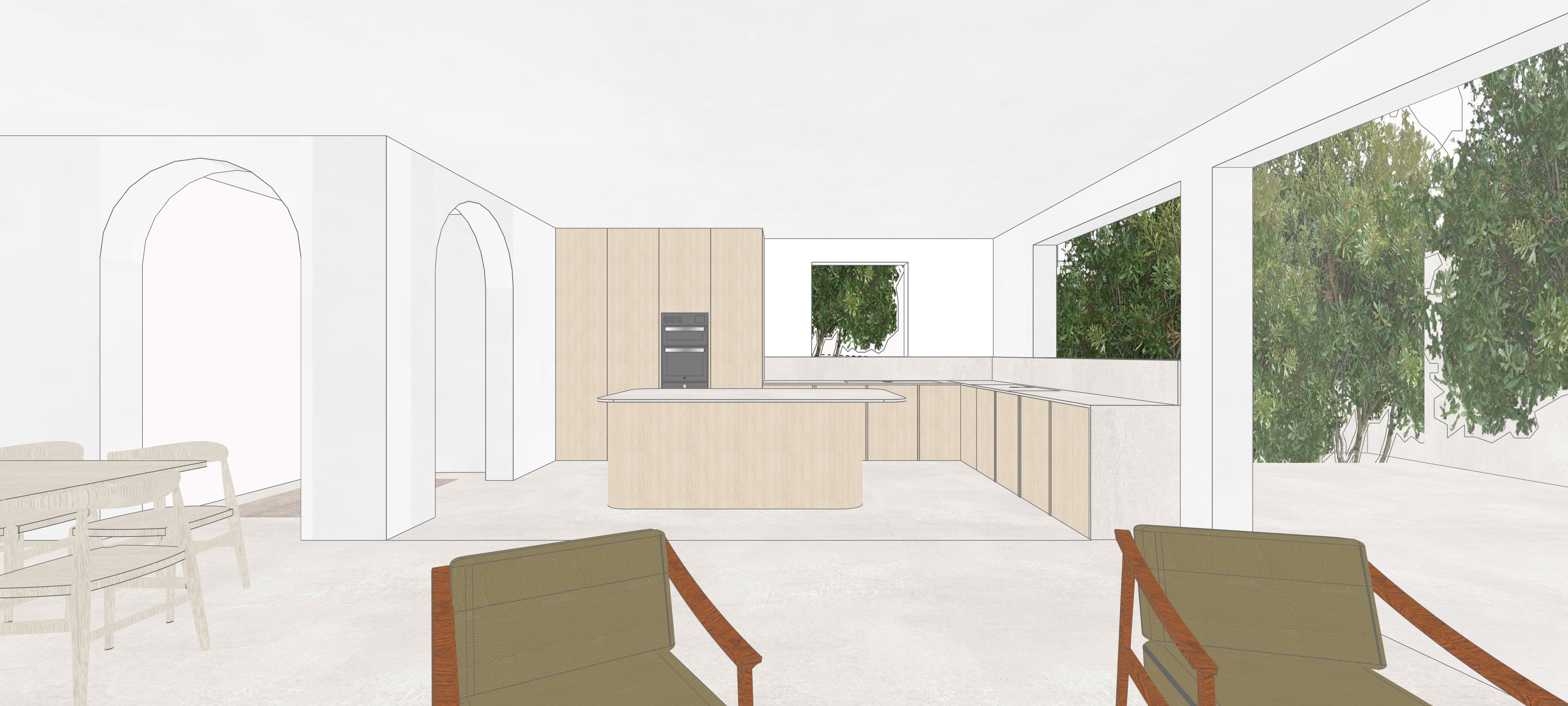 earthy mediterranean open concept living space minimalistic design off white textured walls and ceiling create a clean airy atmosphere natural light floods the room through large windows with lush green trees visible outside adding a vibrant contrast mid wood tones for the kitchen island and dining furniture enhance warmth neutral sandy colored floors provide an earthy balance olive green cushions on sleek chairs introduce subtle color depth soft relaxing ambiance with a touch of nature for tranquil living