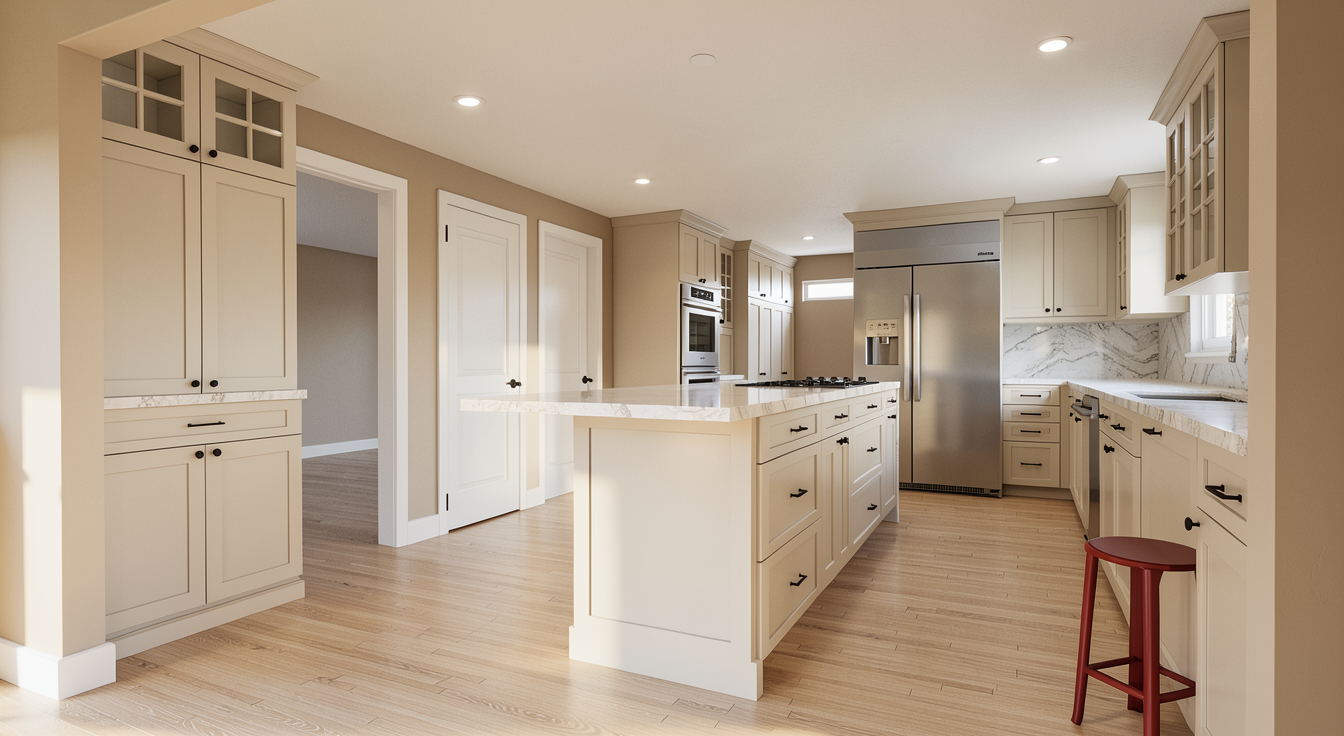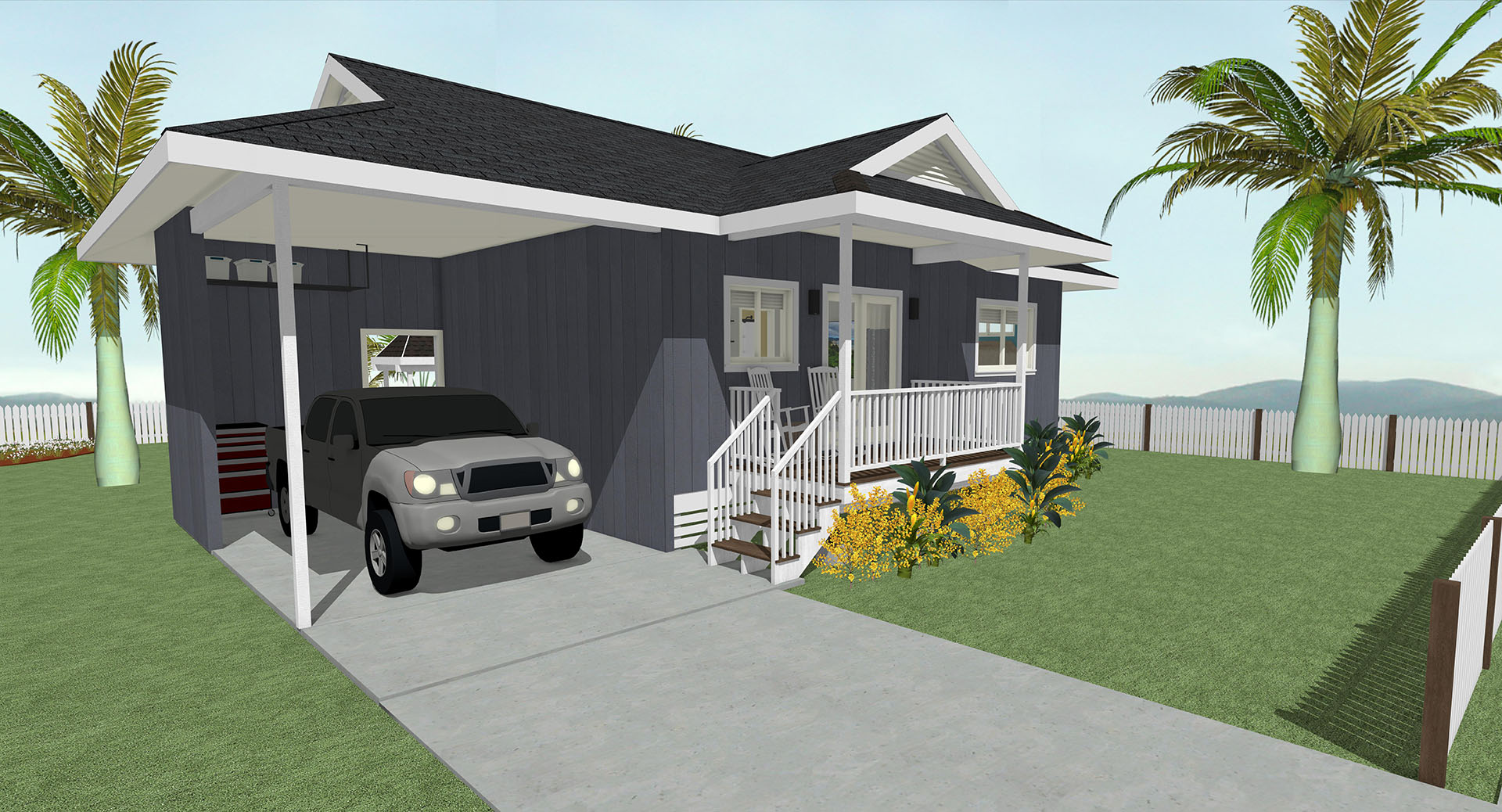 transform this architectural cad rendering into a photorealistic residential home image strict requirements maintain the exact structure proportions rooflines window placements door locations and layout from the original image do not redesign reinterpret or add architectural elements materials and finishes upgrade all surfaces to realistic buildable materials typical of hawai i residential construction natural wood or painted siding asphalt shingle or metal roofing realistic concrete or wood entry elements accurate window glass with natural reflections not mirror like lighting apply natural outdoor lighting consistent with hawai i soft tropical daylight slightly warm sunlight realistic shadow direction and softness no dramatic or cinematic lighting environment enhance the setting subtly without overpowering the home simple clean landscaping grass small shrubs minimal tropical plants realistic ground surface or driveway blue sky with light clouds keep focus on the home not the environment realism the final image must look like a real photograph physically accurate textures and materials correct scale and proportions natural imperfections slight variation in surfaces not overly perfect professional real estate photography quality negative constraints do not change the architecture or layout in any way no added floors no altered rooflines no moving windows or doors no luxury exaggeration or unrealistic finishes no ultra modern or futuristic design changes no excessive or resort style landscaping no people vehicles or distracting elements no stylization illustration painterly effects or cgi look no blur glow or artificial sharpening output goal a realistic buildable and trustworthy representation of the original home design suitable for marketing use without misrepresenting the actual product