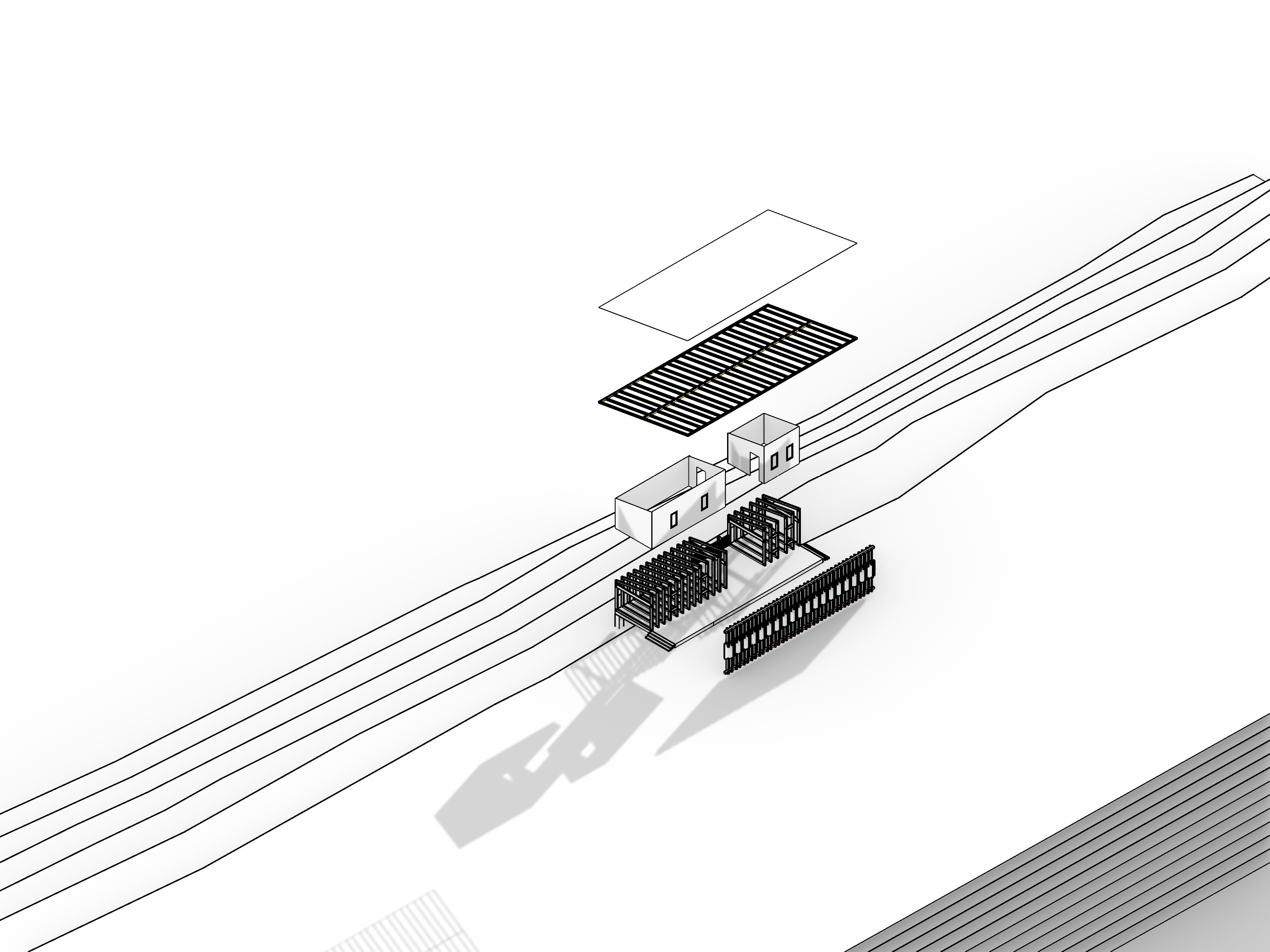 render this architectural section drawing as a realistic atmospheric sectional perspective of a modern woodland cabin on stilts the structure features warm natural wood framing vertical wood screen elements and a dark charcoal standing seam metal roof the ground slopes gently with soft earthy soil and tall grasses the surrounding environment is misty and calm with sage green vegetation and soft fog drifting through the background lighting is soft sunrise light entering from the left creating warm highlights on the wood and gentle shadows inside the interior space color palette is muted and earthy mist green warm sand beige soft clay terracotta natural wood brown and charcoal gray the mood is quiet cinematic contemplative and minimal ultra detailed materials realistic global illumination architectural visualization quality