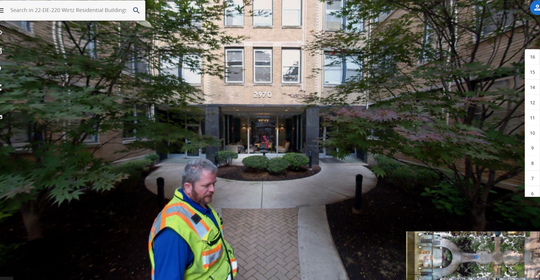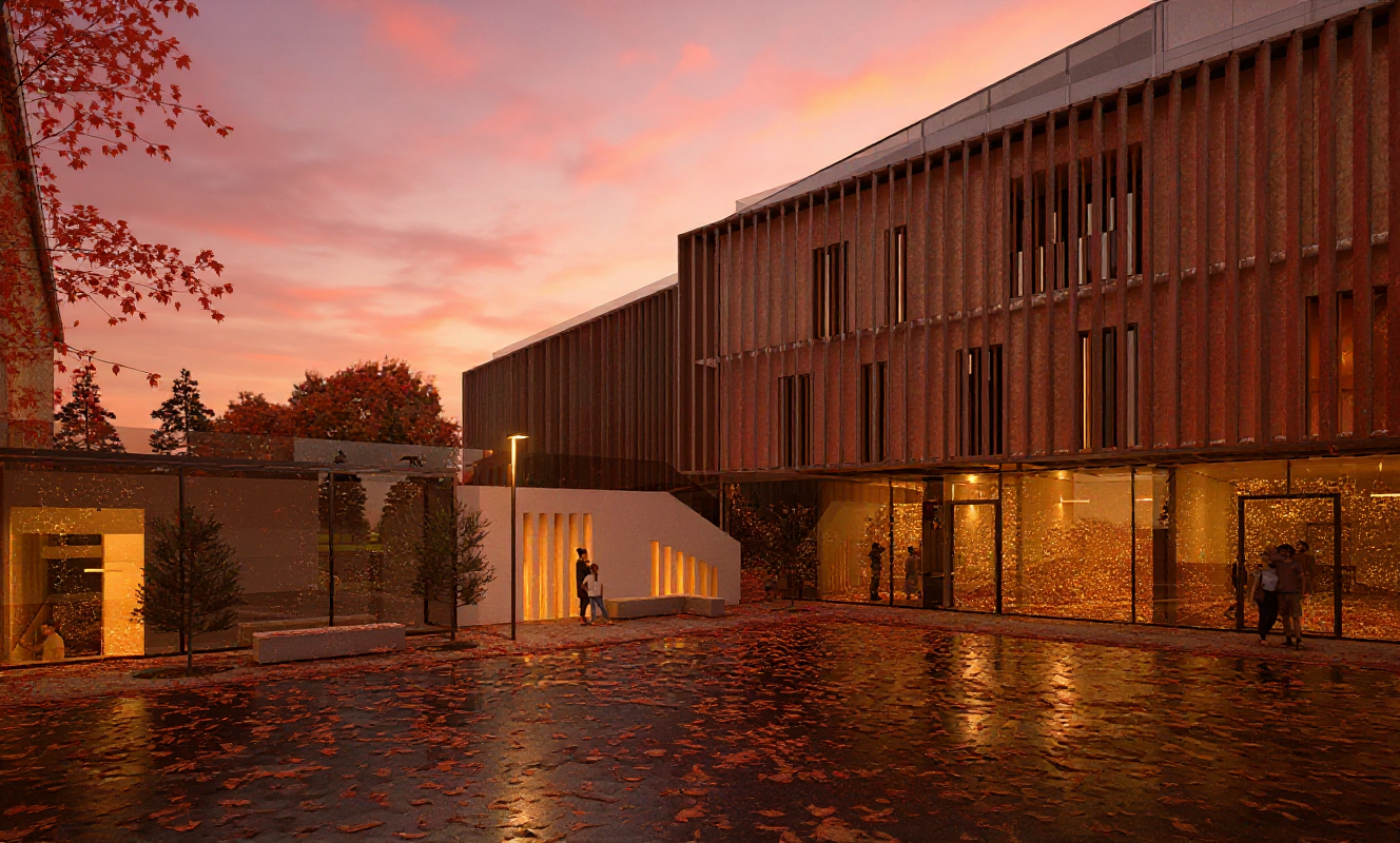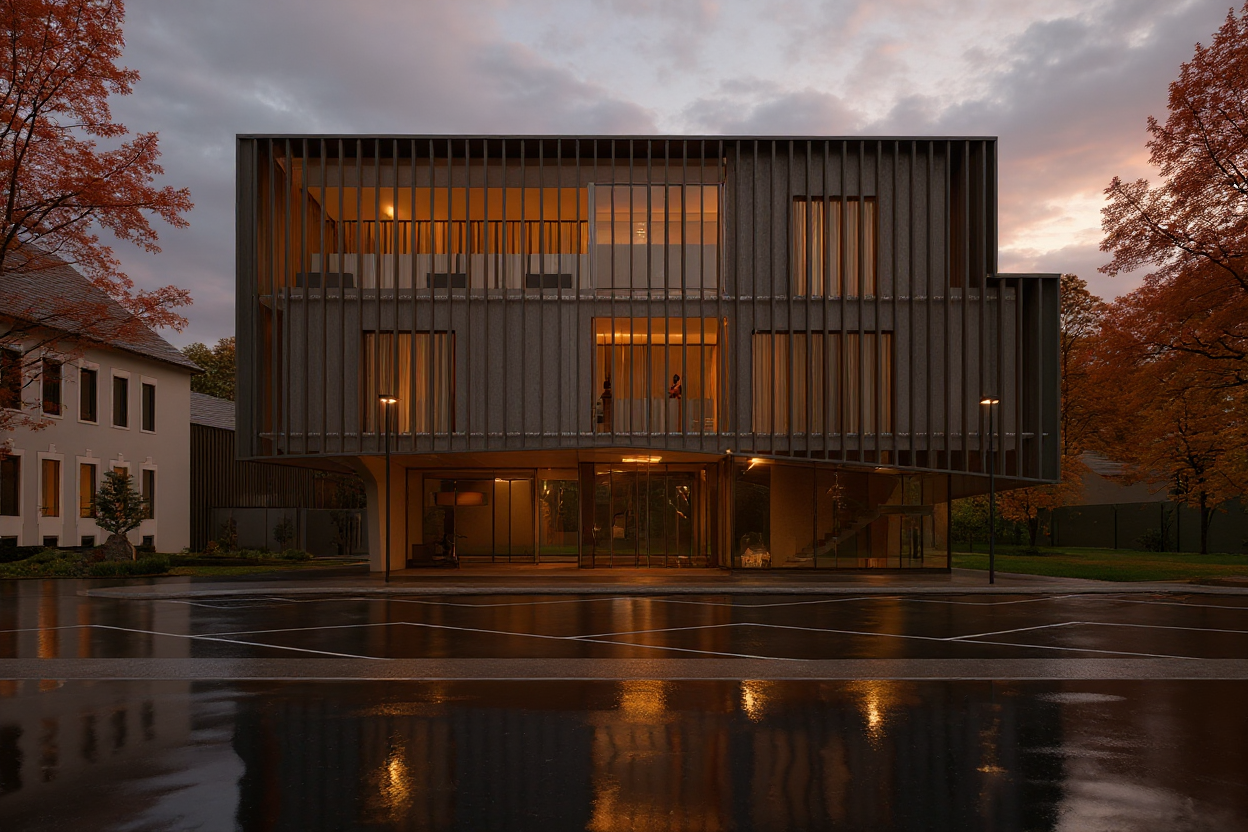 exterior shot remove person in foreground keep architecture the same landscape center path in bluestone planting beds either side in white hydrangea keep trees keep black stone entry surround and canopy use metal vertical and horizontal framed glass for entry single glass door change windows above first floor to a double hung window with single divided light above and below horizontal mullion black framed windows change brick to light beige