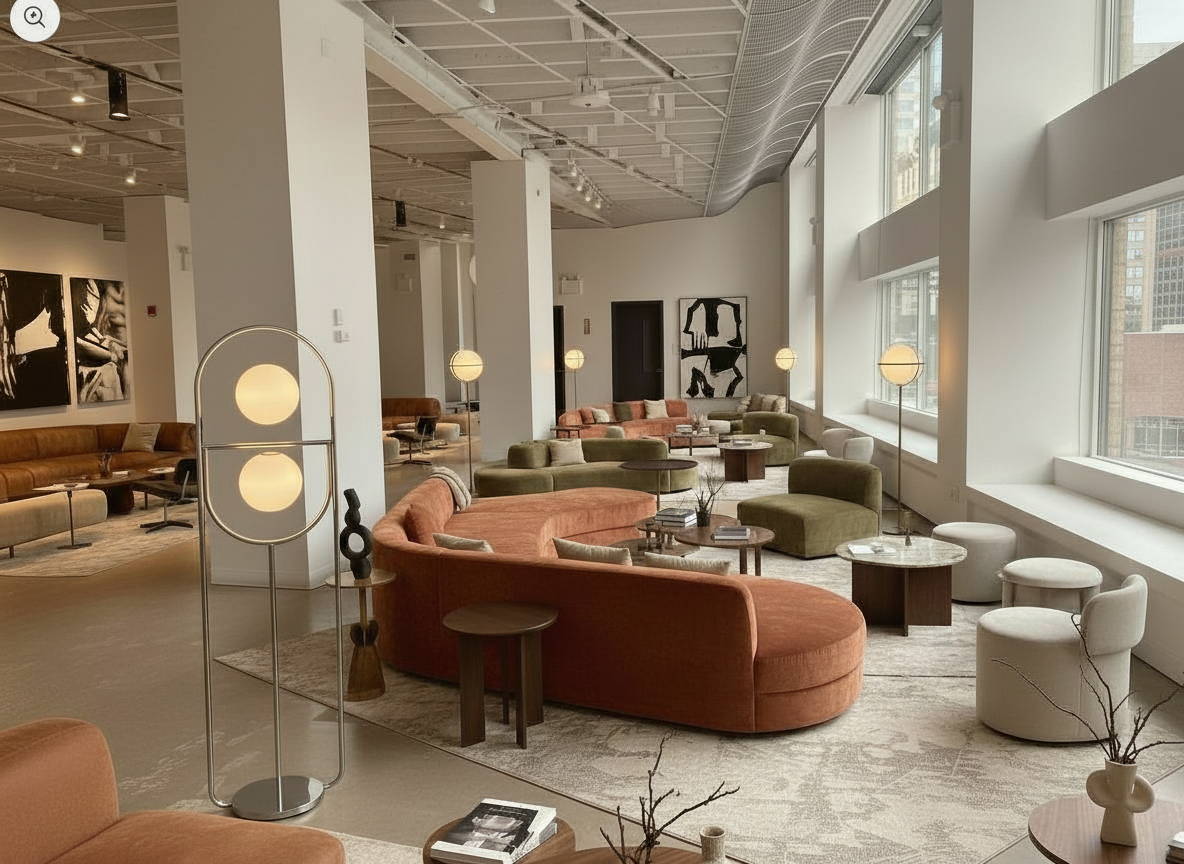 warm up all upholstered furnishings rust terracotta velvets and distressed leather wood tones should be medium and warm replace 50 of the floor lamps with the exact two floor lamps in the reference image the lighting is warm 2200 kelvin the vibe is elevated down town cool do not take any liberties with the architecture or perspective