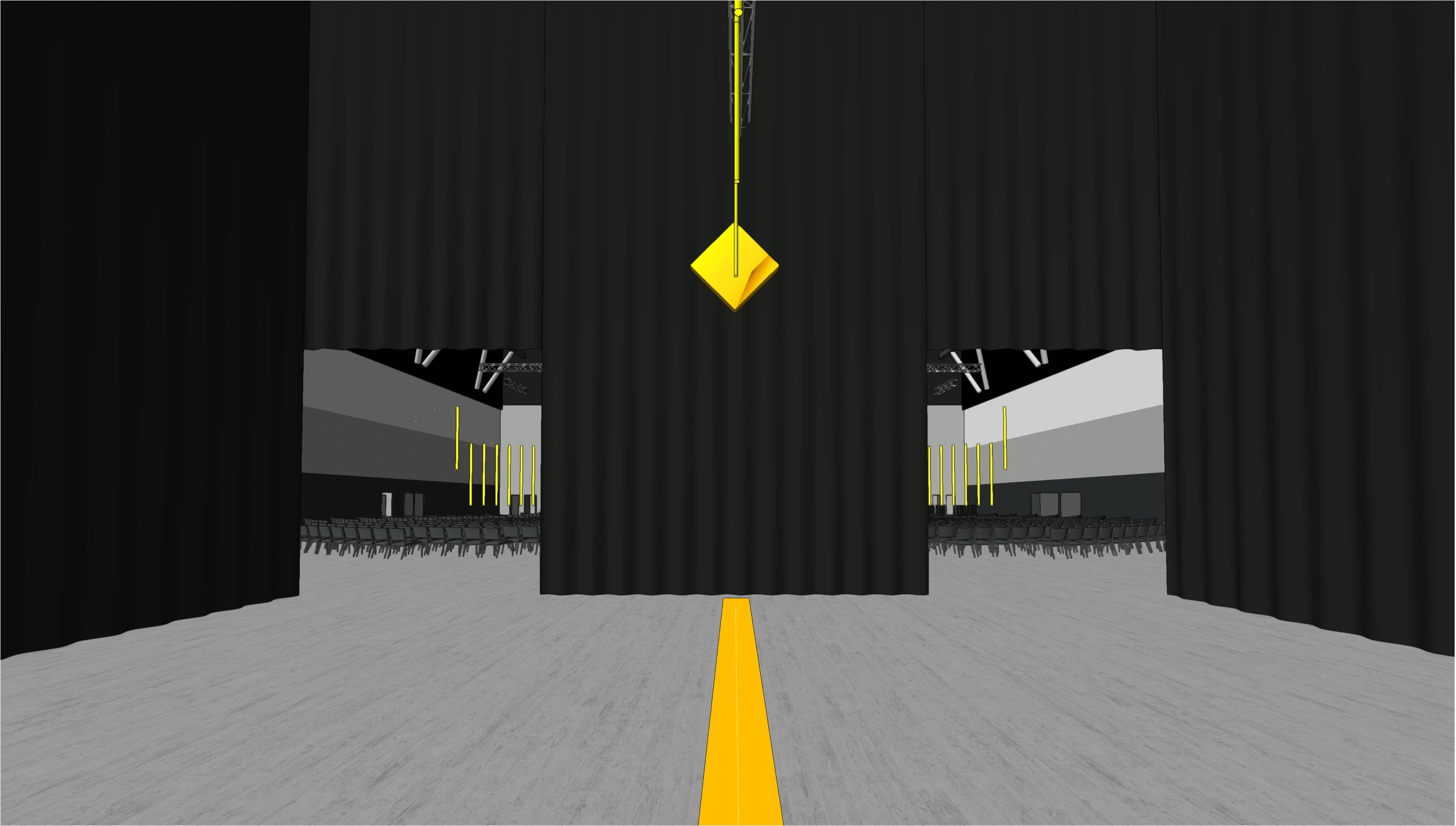 entry moment auditorium scene with a modern and sleek design the focus is on a large black curtain in the foreground with two opening to the auditorium beyond with a bright yellow vertical line centered and leading to a suspended geometric yellow beacon with a soft yellow glow the backdrop features an array of seats enhancing the elegant setting suspended yellow light fixtures provide ambient lighting in the distance creating a sophisticated and dramatic atmosphere the floor is ploished grey concrete with soft light reflections from the yellow glow contrasting the dark elements while soft diffused spotlighting adds depth and highlights architectural details