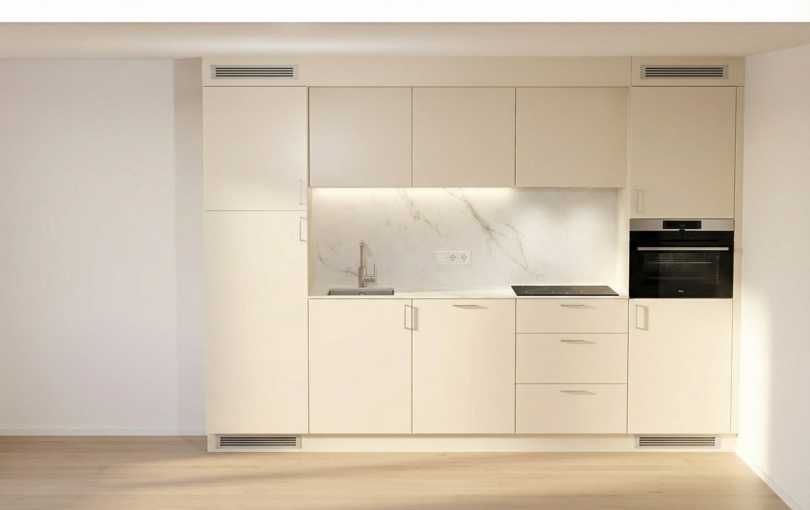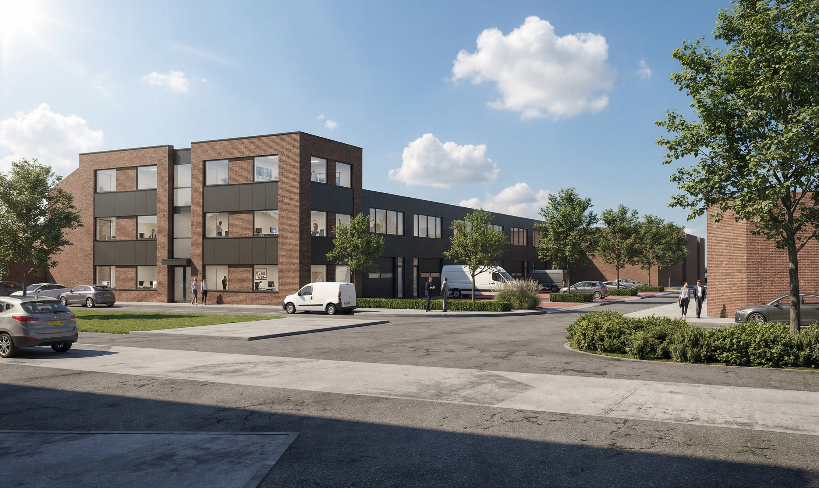 keep the exact same geometry scene content object positions materials textures and camera framing as the original render apply only atmosphere lighting mood and color grading set the scene at dusk sky with thin soft clouds and a cool to warm gradient steel blue overhead transitioning to warm tones near the horizon use cinematic soft lighting with moderate contrast gentle shadows cool ambient fill and warm interior window glow inviting realistic wet ground with realistic reflections on asphalt paving subtle specular highlights very subtle bloom around light sources crisp but natural detail plus a very light atmospheric haze for depth color grade cool shadows cool midtones warm highlights teal in shadows and midtones warm highlights controlled saturation clean neutrals no oversaturation photorealistic architectural marketing render look balanced exposure slightly cool white balance remove the fog make it brighter important desaturate the green 50 keep the sky from the fog render remove the light line from the top of the building make the render softer remove the people add a little contrast remove the car desaturate the image by 30