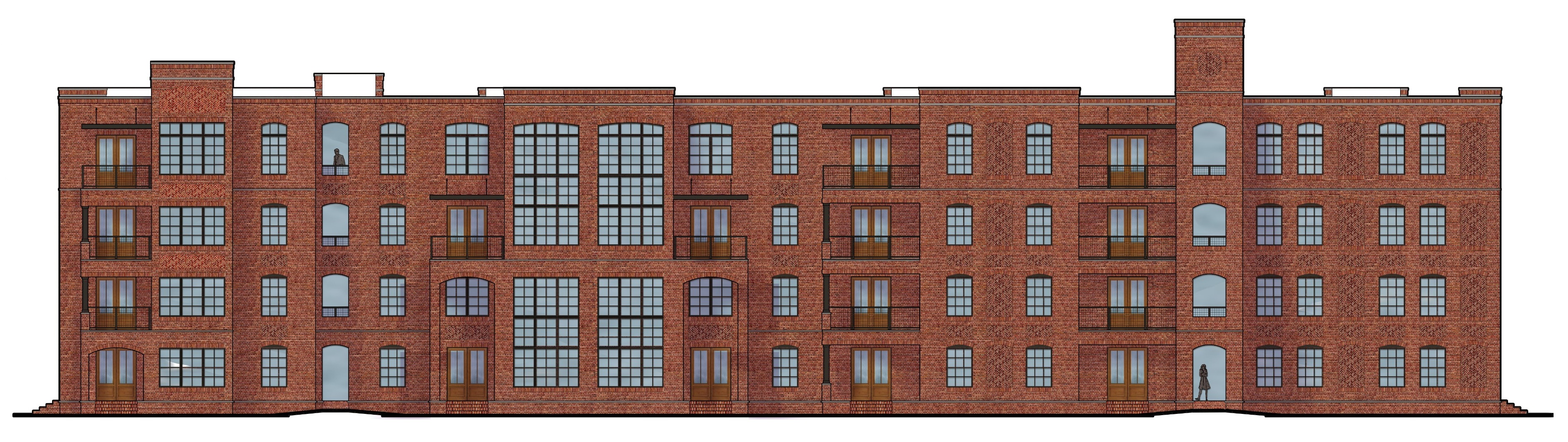 modernist exterior shot a beautiful rendering of a classic brick building with an industrial style featuring warm reddish brown bricks and large elegant grid windows reflecting the sky the windows are a soft steel blue and the wooden doors and balconies are in a rich mahogany finish the scene is set in a tranquil golden hour atmosphere with soft ambient lighting highlighting the details casting gentle shadows that add depth and character to the architecture architecture