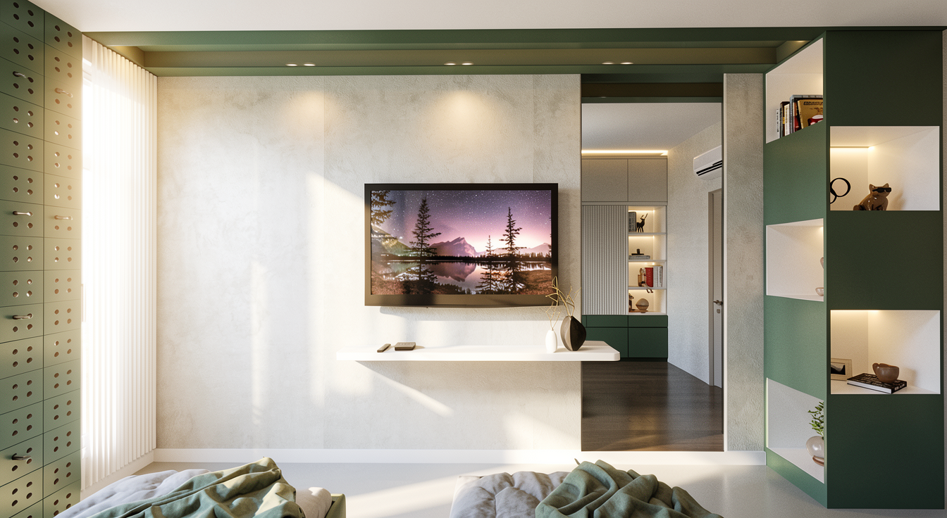 render the scene in high resolution with ultra realistic lighting preserve all objects colors textures and positions exactly use warm natural daylight entering from the left soft shadows and subtle indirect lighting for depth minimize artificial glow on furniture at the top maintain the olive color slightly darker velvet texture on the bed headboard and subtle led lights in shelves emphasize realistic wooden flooring parket do not change anything else ensure mirrors do not reflect the window focus on natural warm lifelike atmosphere
