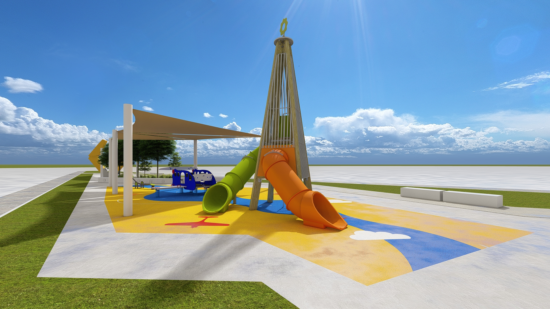 ultra realistic architectural visualization of the provided playground structure strict preservation mandate maintain 100 fidelity to original design exact geometry proportions layout color scheme slide positions canopy structure flooring graphics and material finishes no redesign no scaling changes no added or removed elements environment integration place within a believable urban park context realistic grass variation subtle distant mid rise residential buildings with atmospheric perspective naturally distributed mature trees non symmetrical placement mild wind effect in foliage horizon line consistent with camera height human interaction realism children actively using all playground components natural body mechanics with correct weight shift and balance hands gripping rails correctly feet placement accurate to slide entry and landing zones one child mid descent in orange slide slight motion blur one climbing structure interior one entering green tube others interacting near shaded play zone candid unstaged behavior no posed symmetry varied ethnic representation natural facial expressions clothing reacting to gravity and movement lighting physics accuracy midday uae sunlight strong but not overexposed physically correct sun angle consistent shadow direction across all objects and people soft penumbra edges realistic ground contact shadows subtle bounce light from epdm flooring affecting lower surfaces mild lens glare from sun physically plausible material realism hdpe slides subtle surface roughness slight micro scratches powder coated steel correct specular highlights non plastic reflection fabric canopy tension realism translucency response to sunlight epdm flooring granular texture slight color variation concrete benches edge wear mild tonal inconsistency camera composition professional architectural photography 35mm lens equivalent eye level perspective 1 6m height balanced exposure no blown highlights foreground sharp mild depth of field falloff toward background true to life scale cues 8k clarity photoreal color grading no cartoon saturation micro detailing subtle dust accumulation in joints realistic shadow occlusion at slide ground contact footprint scuffing in epdm high traffic zones slight motion blur only where physically justified no cgi look no artificial sharp edges no plastic humans no symmetry bias