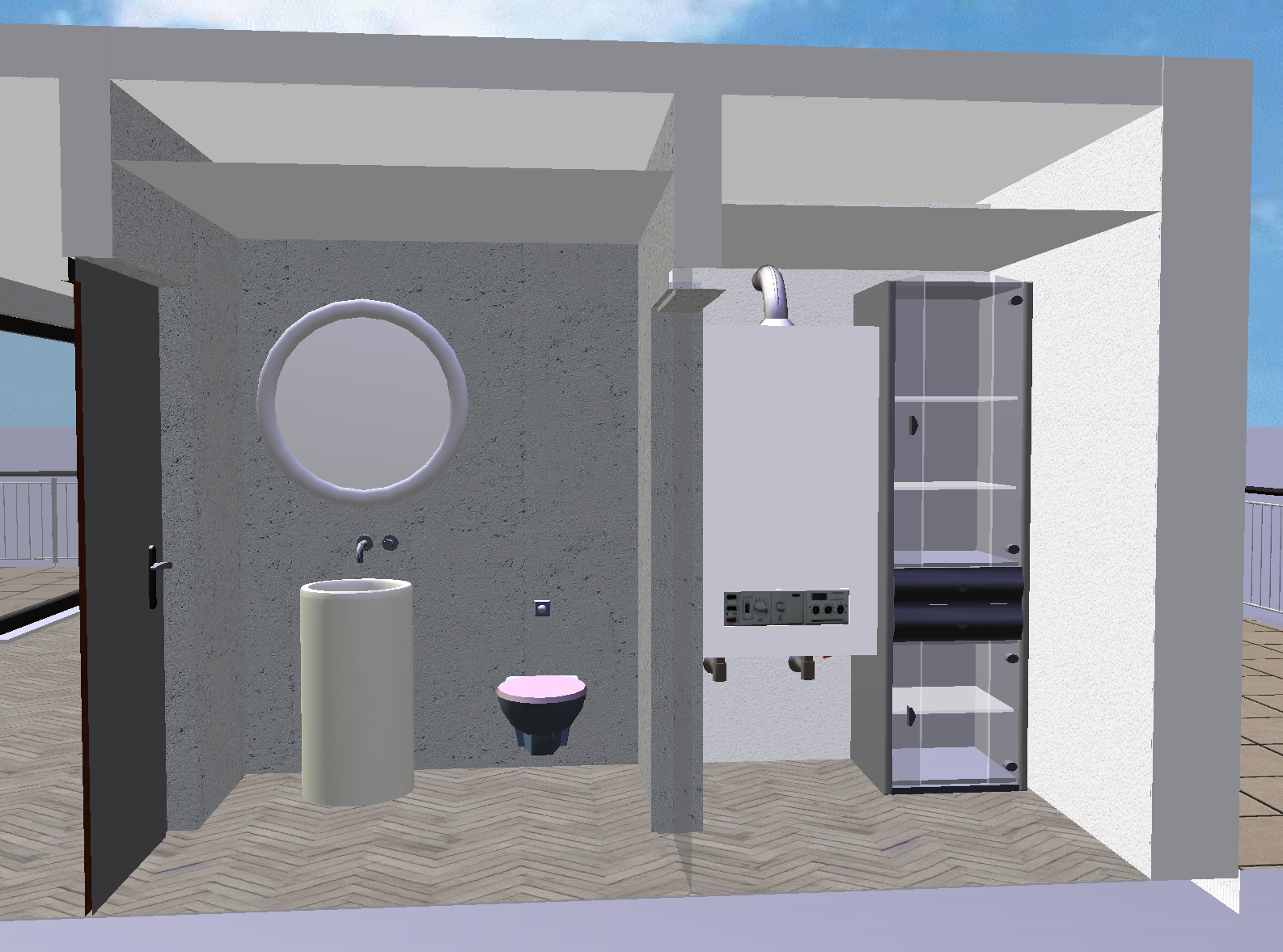 genau dieses rendering berarbeiten fotorealistisches innenraum foto exakt dieselbe perspektive und kameraposition wie das hochgeladene referenzbild 100 identische raumgeometrie exakt gleiche m belanordnung exakt gleiche verlegeart und richtung von parket wie vorlage parket ruhig und hellgrau weiches nat rliches tageslicht raum k nstlich ausleuchten sanfte realistische schatten realistische materialien echte holztexturen hochwertige oberfl chenreflexionen lavabo aus marmor collemandina grigio in braungrau dunkel dahinter eine gessi wandarmatur edelstahl vollkommen rahmenloser und hinterleuchteter spiegel mit echten spiegelungen modell circus 90 cm von antoniolupi rechts davon die toilette in schwarz matt toilette modell laufen riva tecelux bet tigungsplatte aus glas schwarz toilettenpapierhalter in edelstahl mit papier rechts von der toilette ebenfalls rechts hinten eine toilettenb rste an der wand aufgeh ngt in edelstahl matt alle sichtbaren grauen w nde seite sind sichtbeton rechts weissputz weiss links vom lavabo eine kurze handtuchstange mit weissem handtuch schwarze steckdose rechts vom lavabo auf gleicher h he wie die armaturen im raum rechts ist die technik es ist ein sehr grosses l ftungsger t an der wand aufgeh ngt daneben steht rechts das rack mit der haustechnik und den computern in beiden r umen abgeh ngte decke links abgeh ngt auf 2 30 meter rechts auf 2 20 meter schwarze runde deckenspots in der abgeh ngten decke sehr moderner minimalistischer look nat rliche farbwiedergabe golden hour feeling hell ausleuchten eine echte frau mit blonden haaren steht vor dem lavabo die frau ist 170 cm gross das bild muss wie eine professionelle fotografie aussehen es soll ein echtes und reales foto sein canon eos r5 35 mm festbrennweite f 2 8 hyperrealistisch dslr qualit t raw aufnahme 8k aufl sung extrem scharf perfekte tiefensch rfe professionelle architekturfotografie