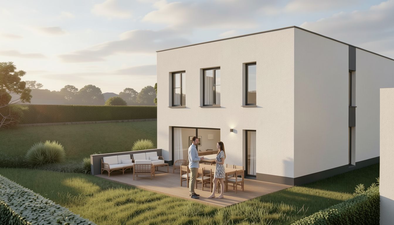 natural stone in the ground floor white window frames ral 5014 paint wooden horizontal facade in 1st floor antracite metal roof solar panels on the roof