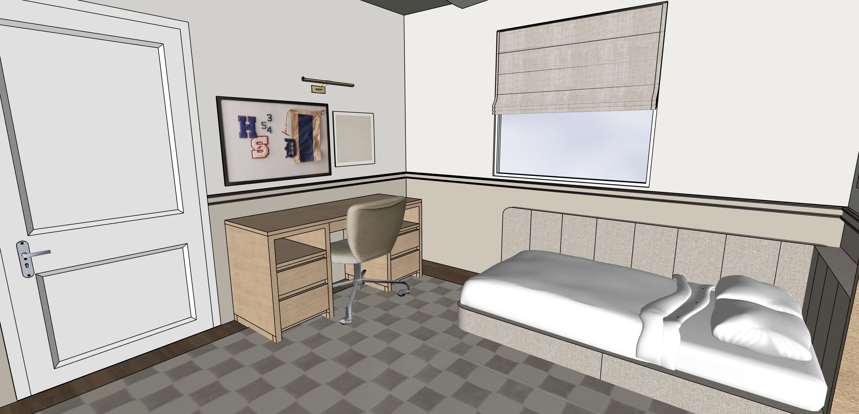 extra large checkered rug in grey and ivory wall are beige grey in the bottom and ivory on the top split by a light grey molding