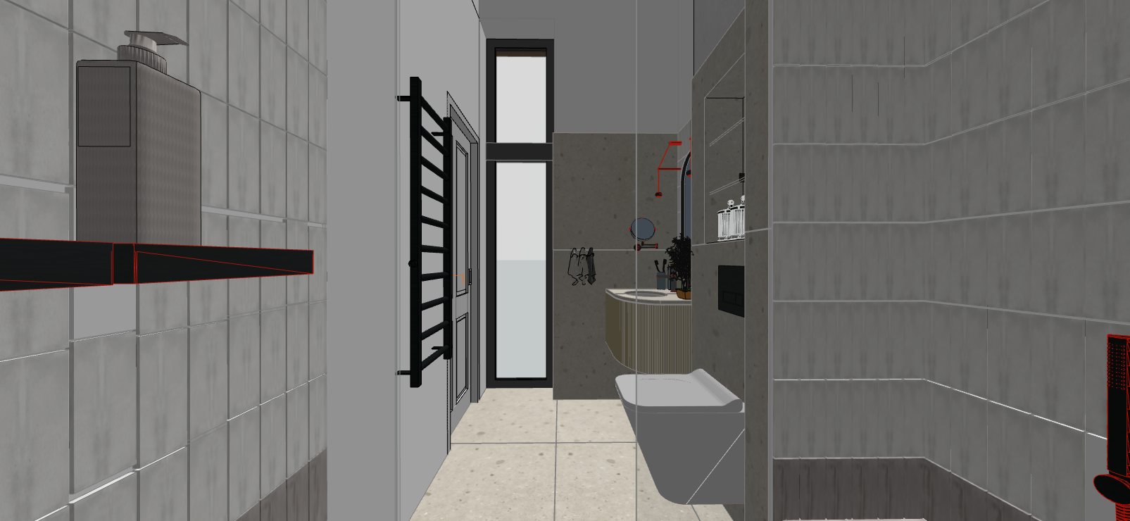 create a render in hyper realistic architectural visualization quality 8k resolution based on the uploaded concept art preserve all details colors and objects as presented in the image do not add remove or alter any elements all objects furniture sanitary ware and architectural features must remain in place do not add any objects or delete anything from the image the spatial configuration must remain unchanged warmth gentle reflections soft shadows enhanced color richness and luxurious level realism improve depth and realism through wood grain richness brass highlights fabric texture and polished clarity while keeping the entire scene exactly as originally designed the white toilet is shiny as the porcelain the little white and grey tiles are shiny as well the built in hole above the toilet is a hidden led light around under the sink countertop s furniture is a hidden led light towards the floor there are downward light from the two wall lamps above the tiles the wall is clear white in this scene spring daylight streams in from the left casting sharp shadows the black taps shower head push plate of the toilet has matt surfaces the furniture front under the sink counter is a light oak