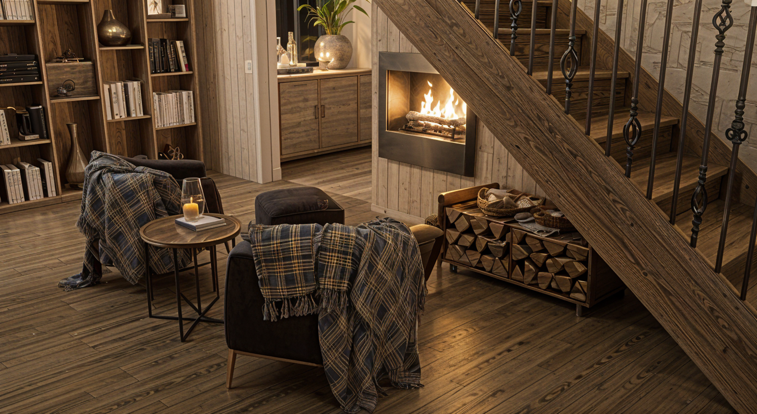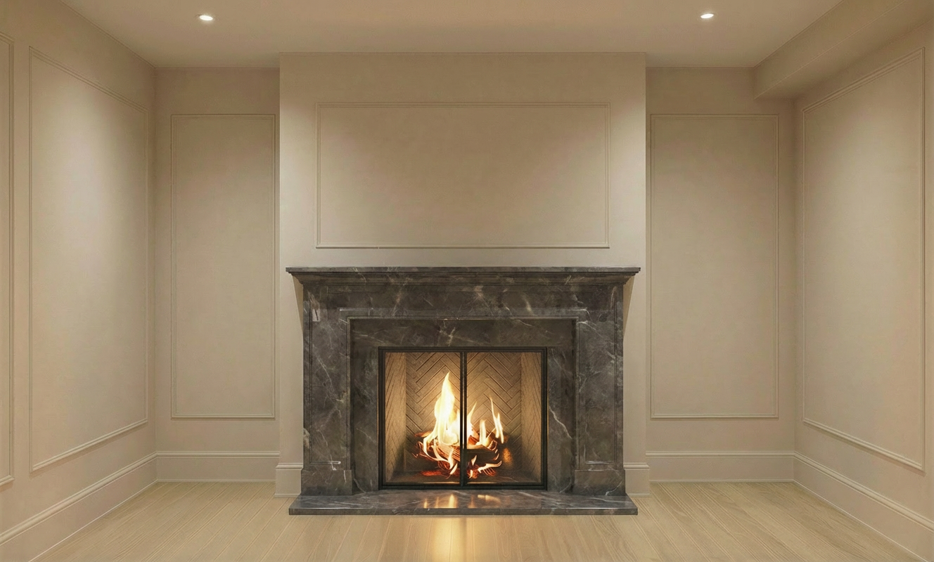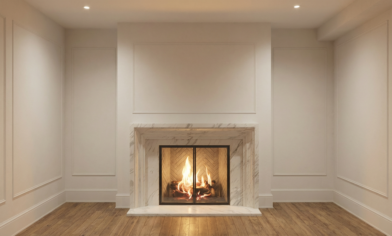 keep everything the same but the herringbone tiles in the fireplace insert more neutral and texturized make sure all the walls and ceiling are a soft off white