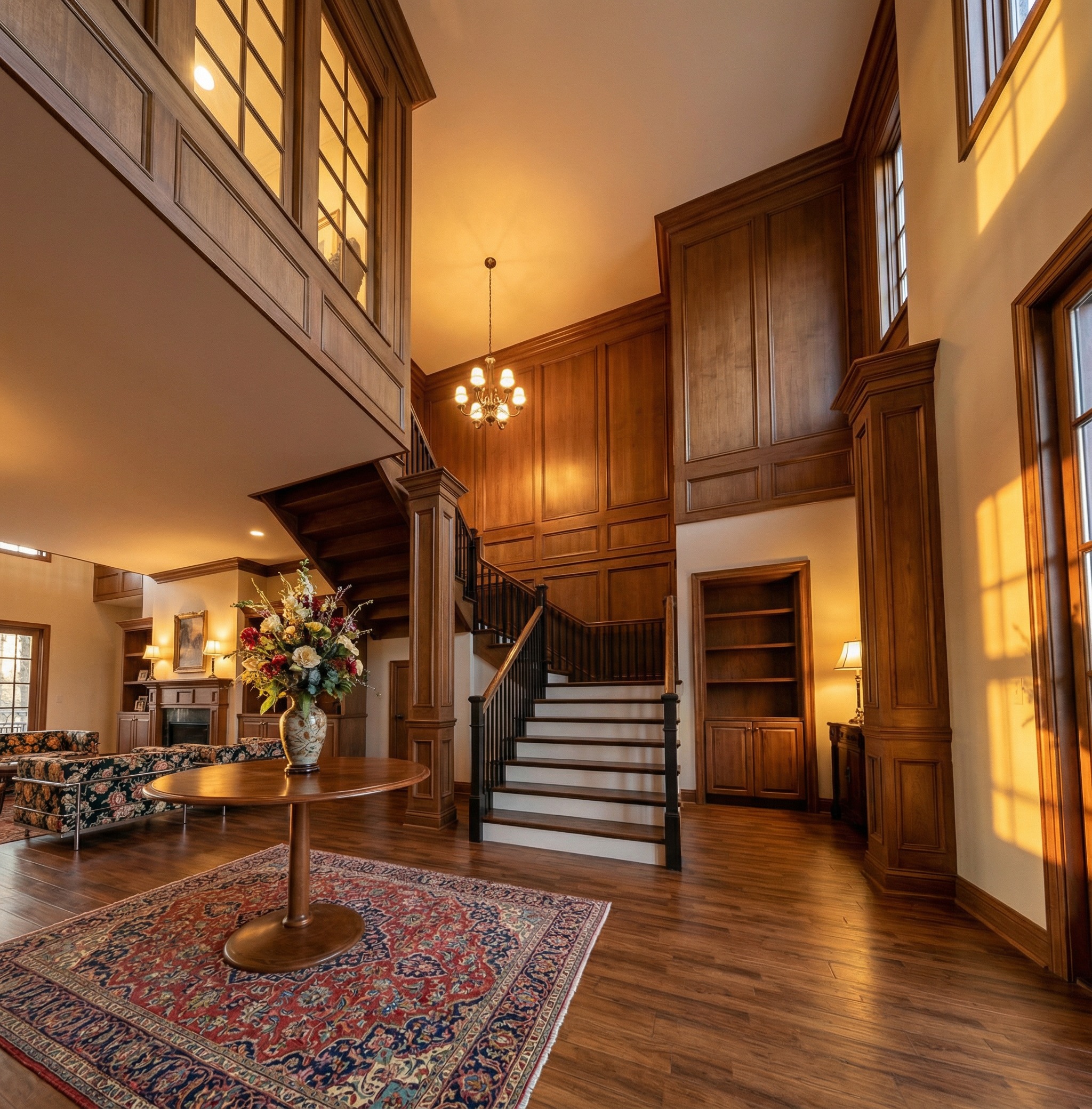 move chandelier centered on doors light colored paneling colorful entry rug add books and art to shelves hide upper stair with light colored paneling