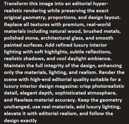 transform this image into an editorial hyper realistic rendering while preserving the exact original geometry proportions and design layout replace all textures with premium real world materials including natural wood brushed metals polished stone architectural glass and smooth painted surfaces add refined luxury interior lighting with soft highlights subtle reflections realistic shadows and cool daylight ambience maintain the full integrity of the design enhancing only the materials lighting and realism render the scene with high end editorial quality suitable for a luxury interior design magazine crisp photorealistic detail elegant depth sophisticated atmosphere and flawless material accuracy keep the geometry unchanged use real materials add luxury lighting elevate it with editorial realism and follow the design exactly