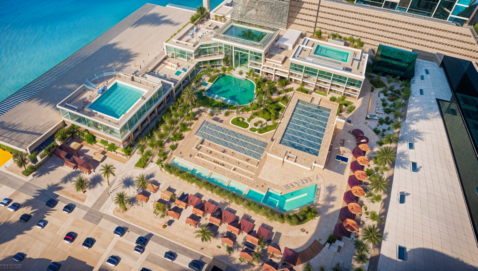 outdoor view shopping center sand stone facade palm trees green roof architecture