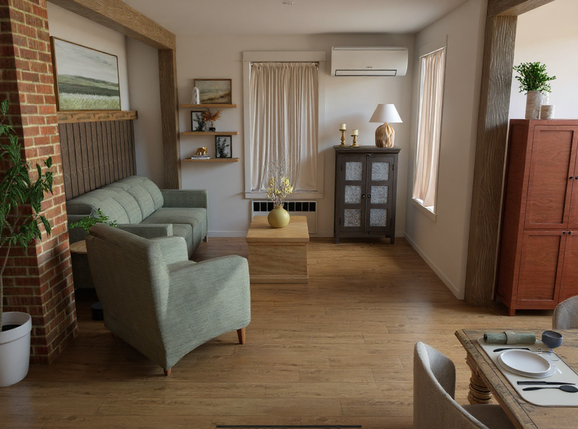 add computer and decor on the coffee table keep furniture the same make the room brighter keep the table the same color no light shadows keep everything the same color add decor on the walls