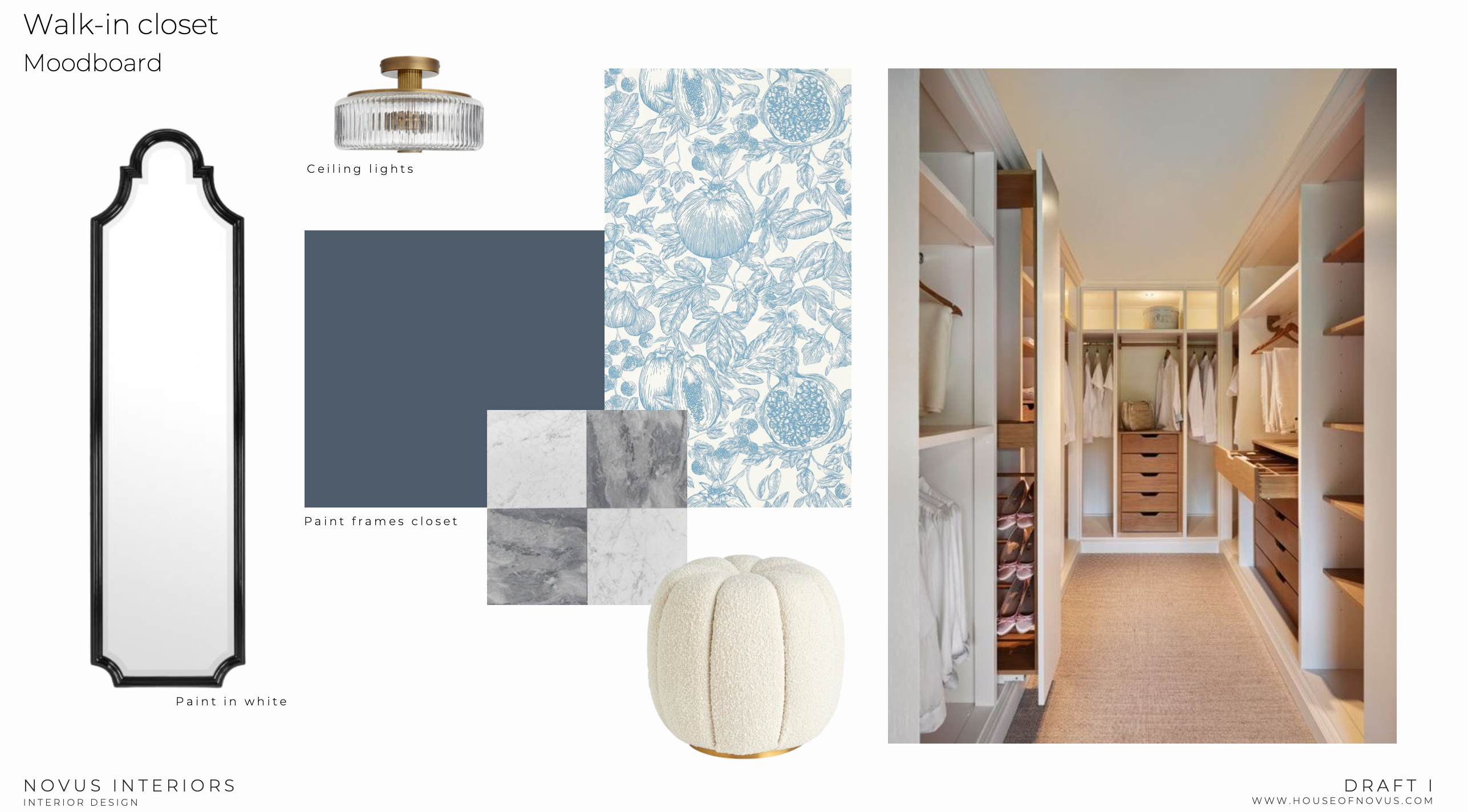 elegant walk in closet with classic detailing and soft refined palette cabinetry is painted warm white with traditional paneling drawers and shelving in warm natural wood tone closet island or bench upholstered in soft boucle fabric in cream walls feature a subtle blue botanical wallpaper as accent additional walls in soft neutral white hardware and lighting are warm brass ceiling light is a classic flush mount with ribbed glass flooring is a light natural woven or soft neutral carpet runner integrated warm led lighting within shelves and hanging sections full height storage with organized hanging rails and drawers overall space feels bright tailored and luxurious with a calm timeless atmosphere