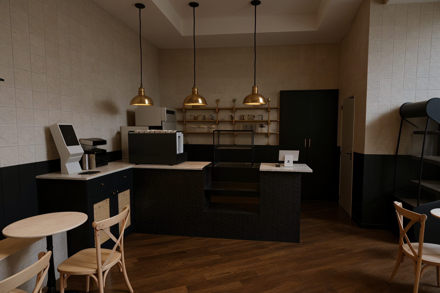 modernist interior shot interior shot render a modern kitchen in a minimalist style featuring sleek white cabinetry with gola black handles incorporate a dark wood paneling for the backsplash and window frame to add warmth the countertops exude elegance with a deep charcoal gray finish design the oven to exhibit stainless steel details with a soft blue light use wide plank oak flooring to enhance the warm atmosphere the walls are a gentle dove gray giving a serene and sophisticated ambiance soft diffused lighting creates a cozy and inviting environment mountains view architecture