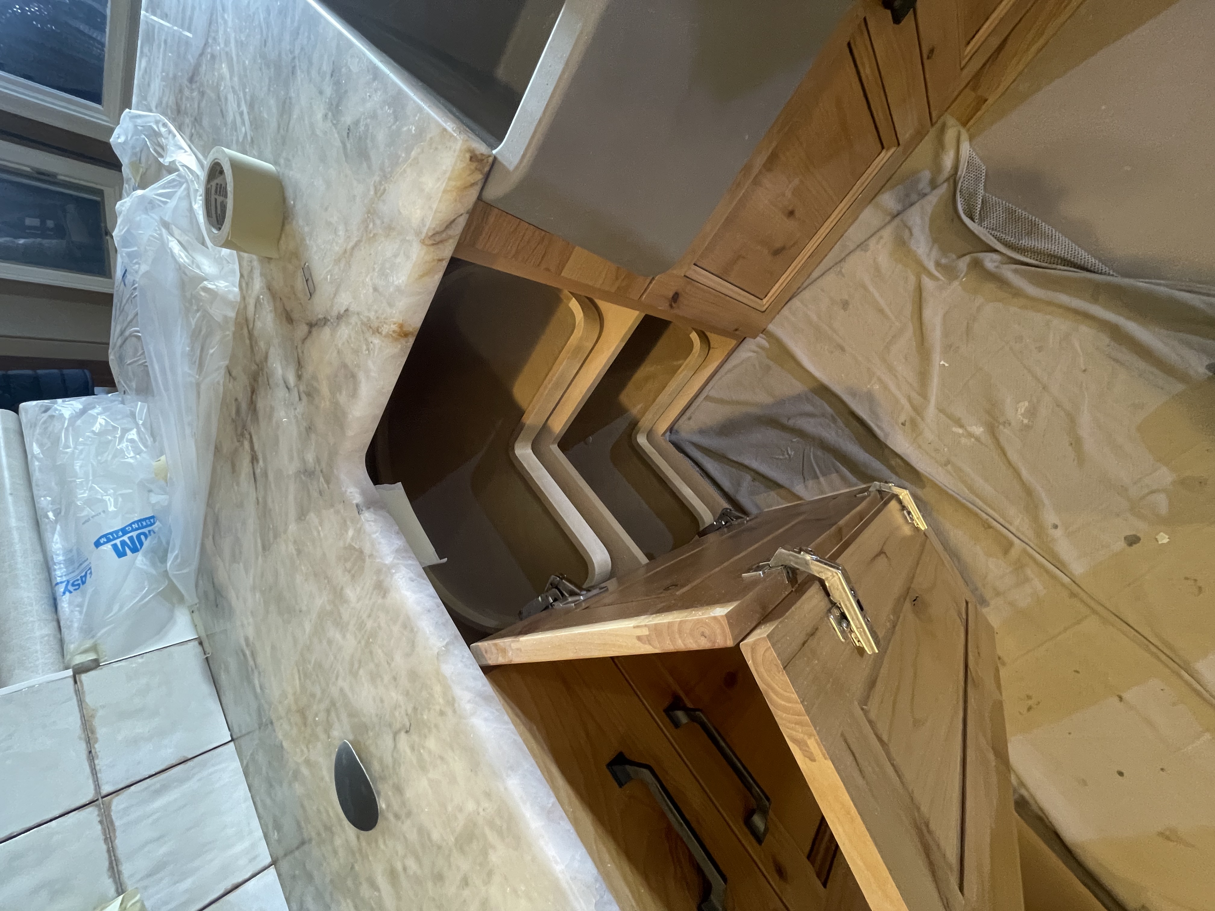 do not change the cabinets in any way preserve the exact cabinet colors materials finishes dimensions door and drawer styles hardware spacing alignment and all geometry exactly as shown do not alter the countertop shape backsplash appliances flooring lighting fixtures or wall structure only remove the construction materials clutter and mess from the scene clean the room and make it look finished and staged add a few simple tasteful home accessories appropriate for the style of the space but do not add or remove any furniture windows or architectural elements maintain the original lighting direction and realism enhance clarity and polish the photo while keeping the cabinetry and room design completely unchanged do not alter the lighting to keep the cabinet colors as they are in the image keep the cabinet door that is open the exact same