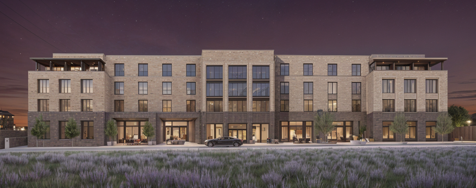 a industrial hotel in fort worth texas plaster and stone walls steel framed windows strong geometric forms rooftop terraces with greenery symmetrical fa ade and dramatic nighttime architectural lighting western traditional design architecture