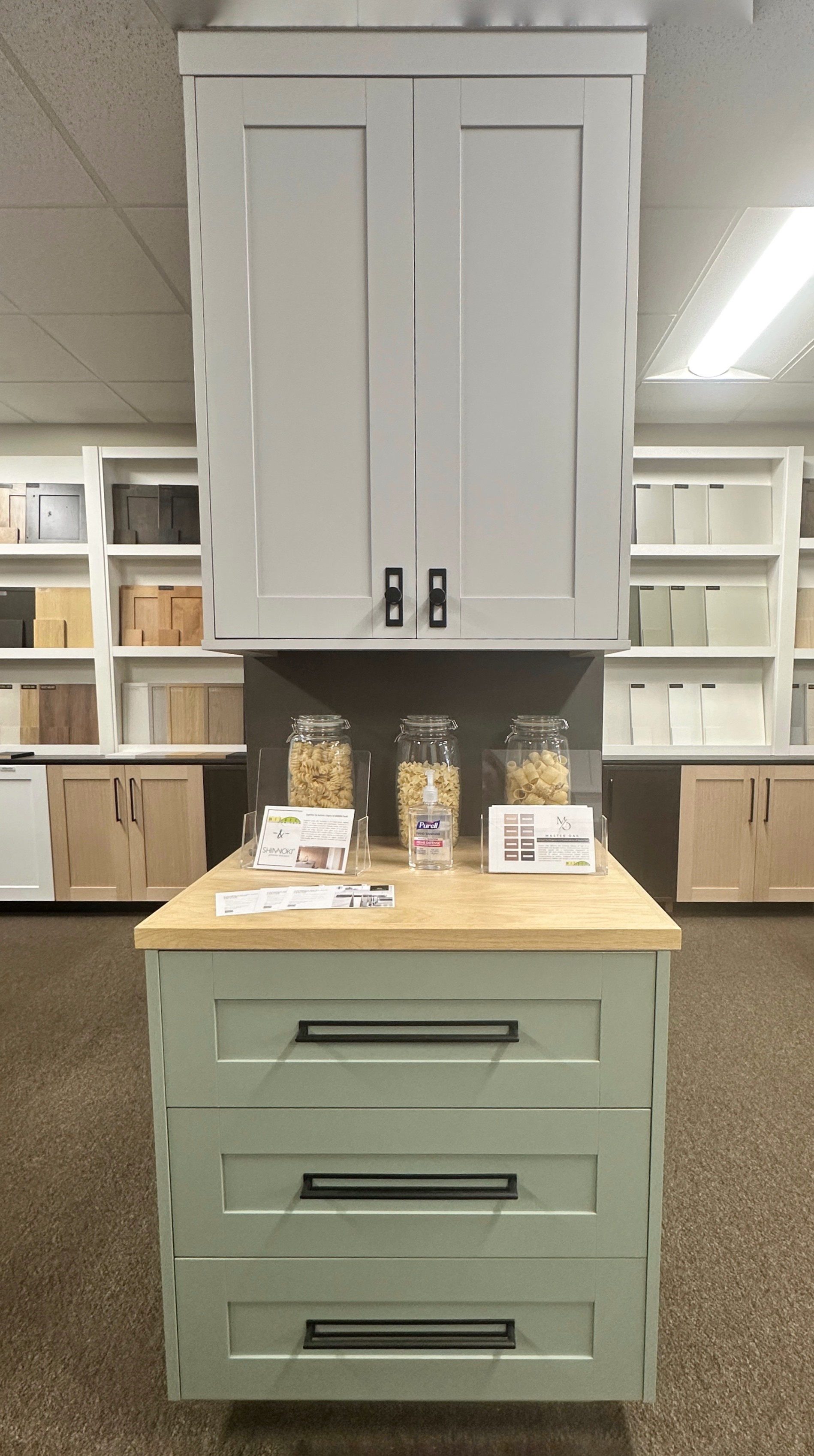 restage this wood top put these uppers and lowers in a row of 3 and put them in a house freestanding on a wall with natural light make it so that there are two drawer banks