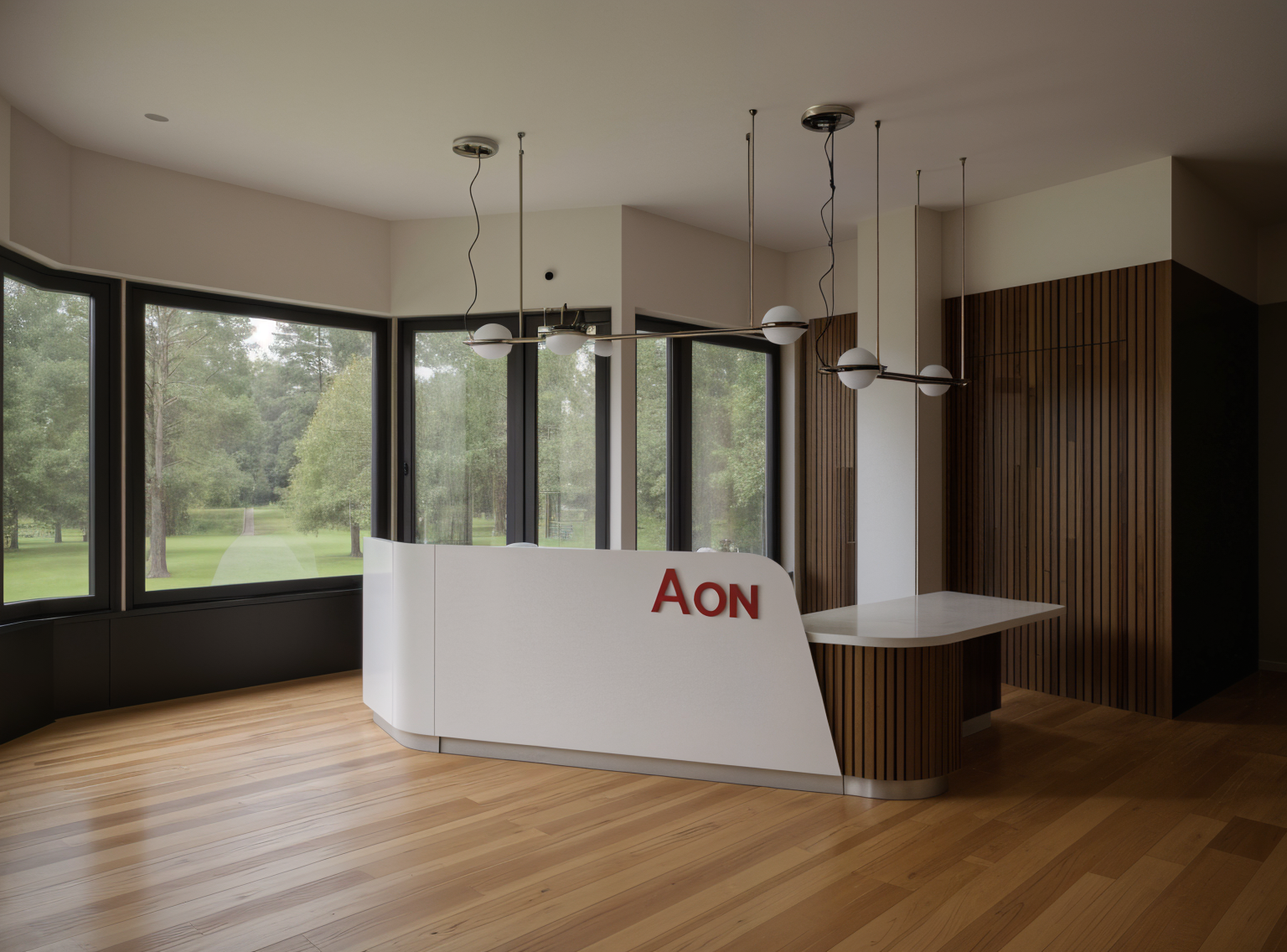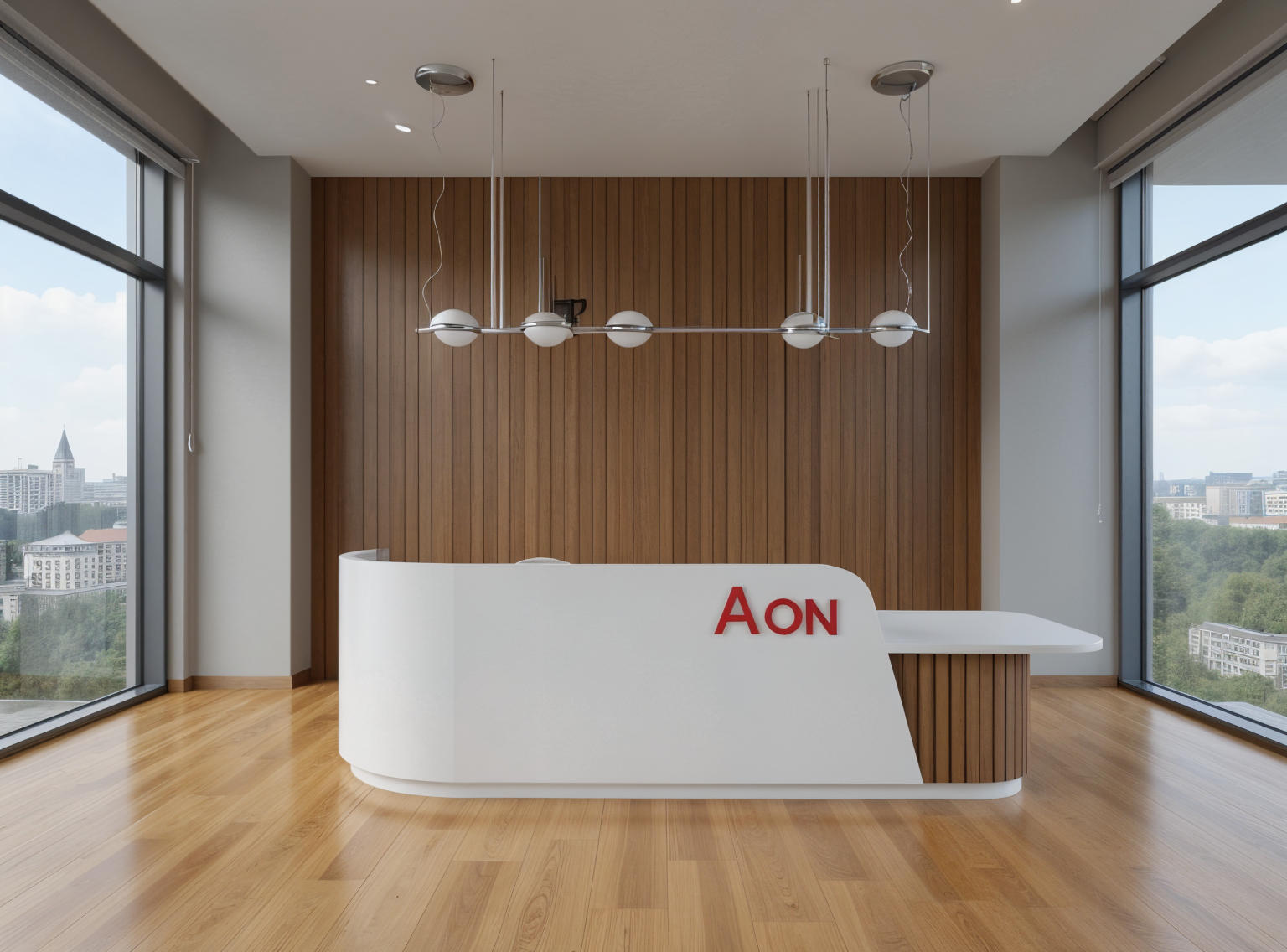 render a modern interior reception area the main desk should be a glossy white with the letters in bold red the backdrop should feature vertical wooden wood upp panels in oak creating a sophisticated contrast large windows let in plenty of natural light showing the skyline of vienna in the background enhancing the light gray walls the floor is a warm natural oak wood finish include modern hanging light fixtures in metallic silver giving the space a polished elegant atmosphere keep the perspective don t change it
