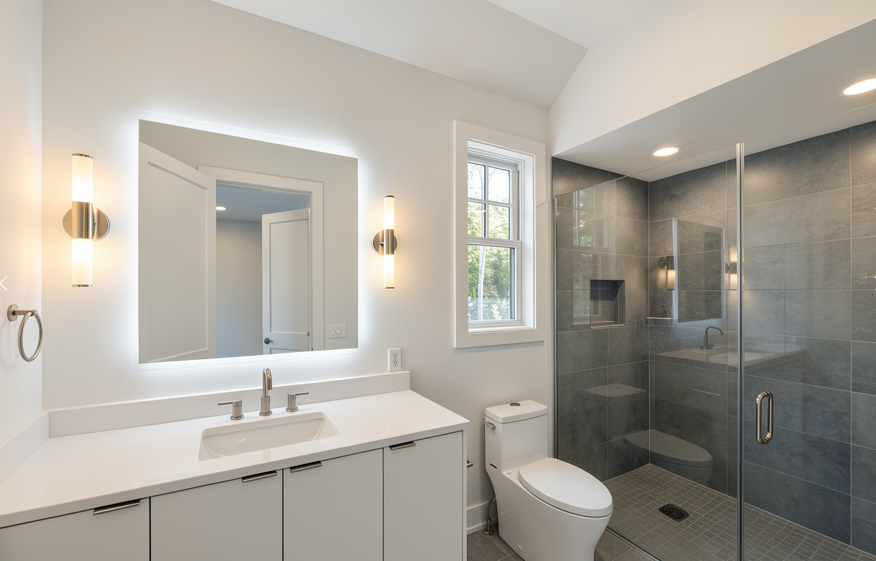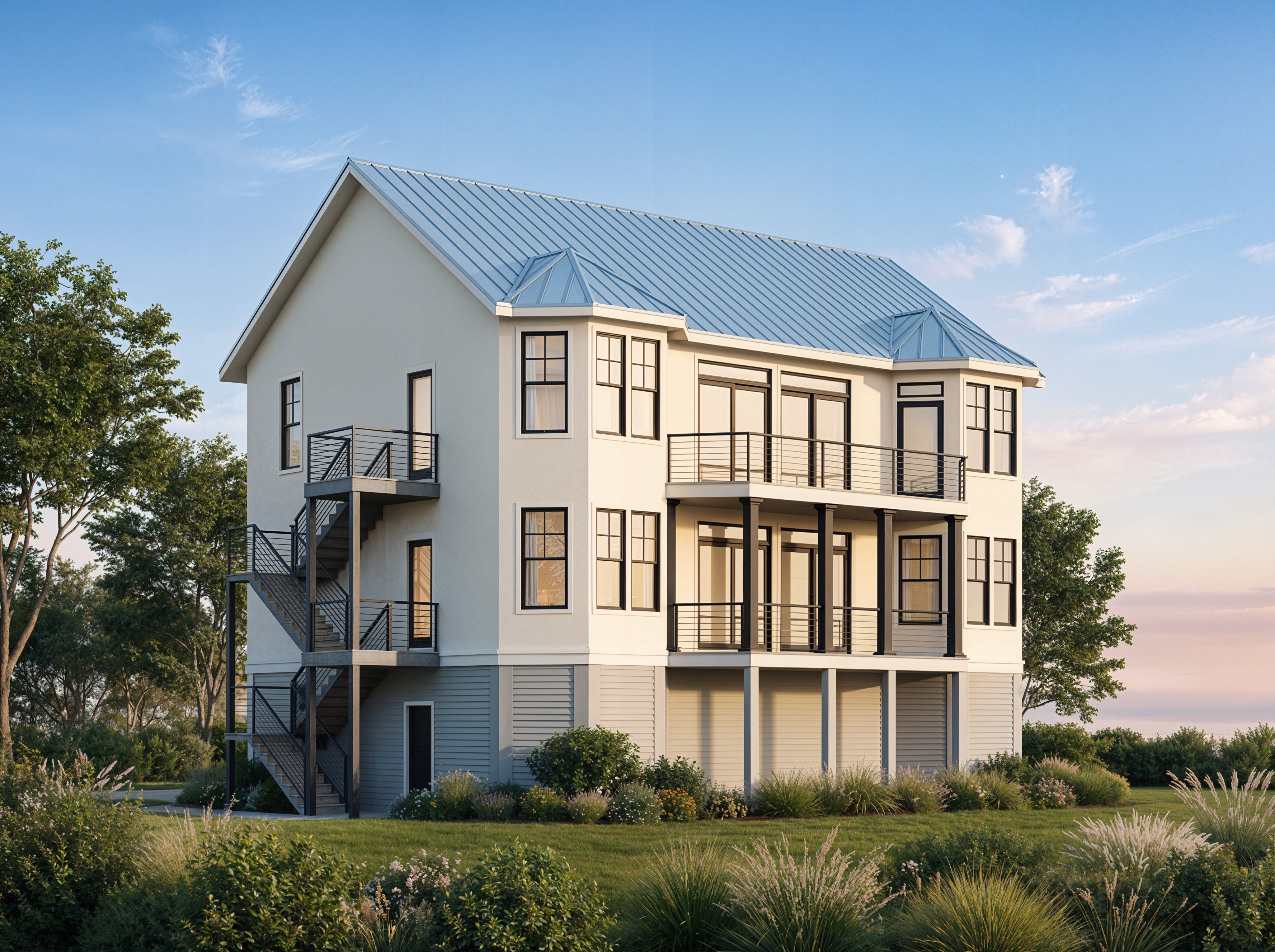 spring time afternoon harp lights white frames trees more realistic at the background show different height of trees inside the buildings show furniture the windows are darker the lights in landscape should be realistic and metal material show real lightings for landscape lights light blue siding dark gray metal standing seam roof cedar posts