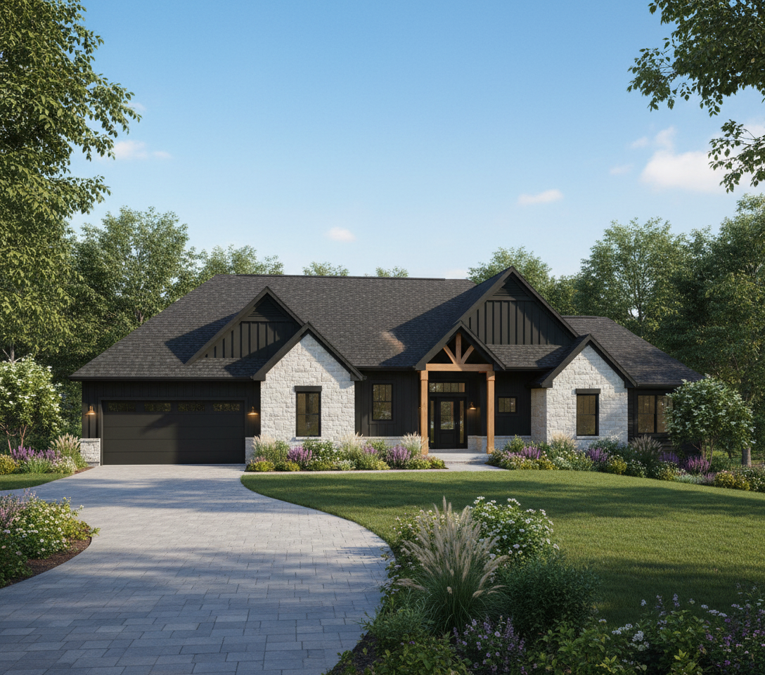 a manicured lawn layered flower beds low maintenance shrubs native plants stone pathway leading to the entrance