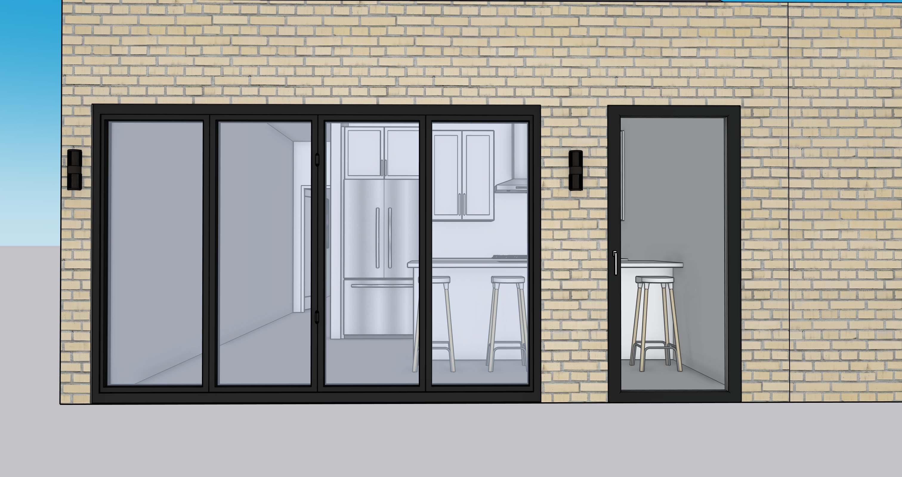 make photo realistic and add a roof soffit at the top of the wall the bricks are a light beige color