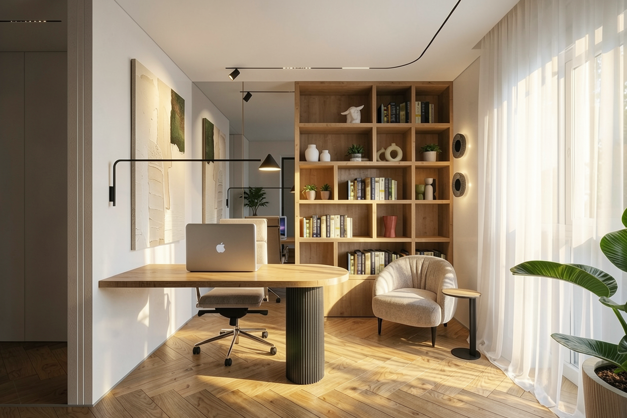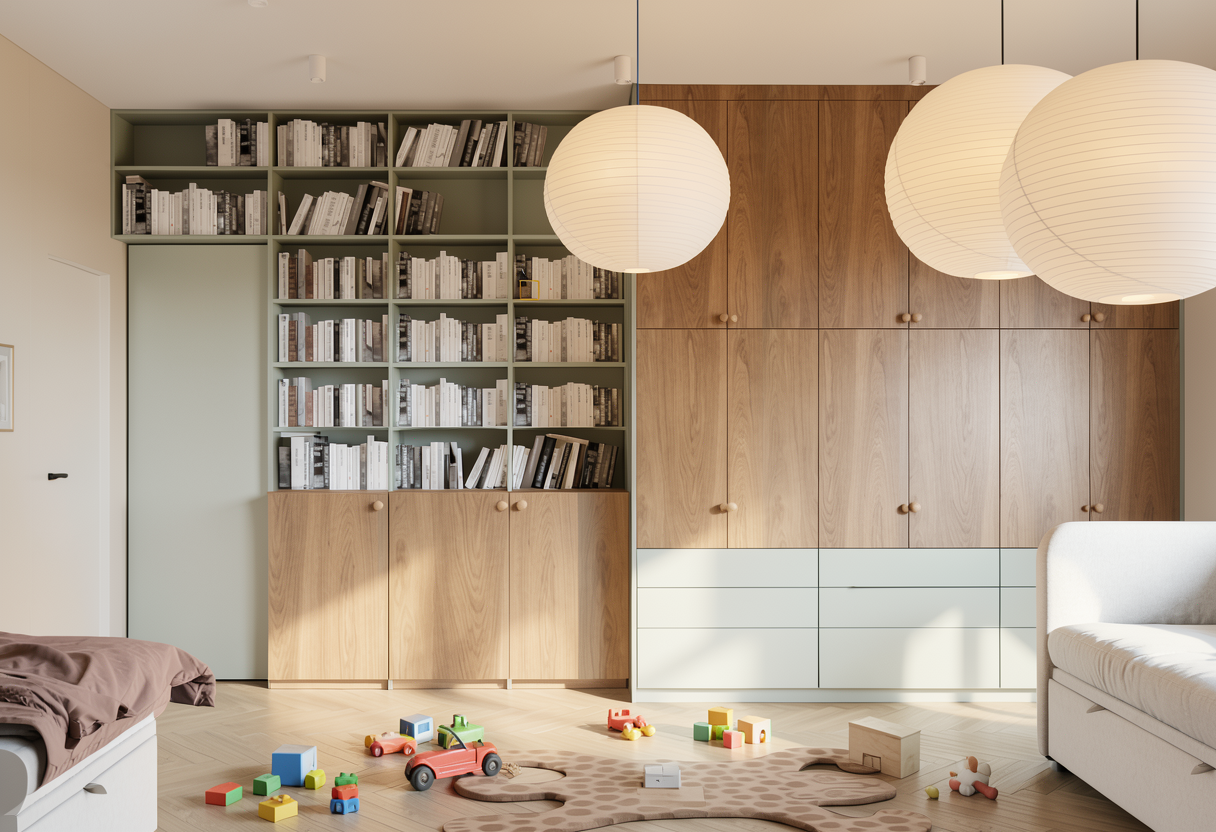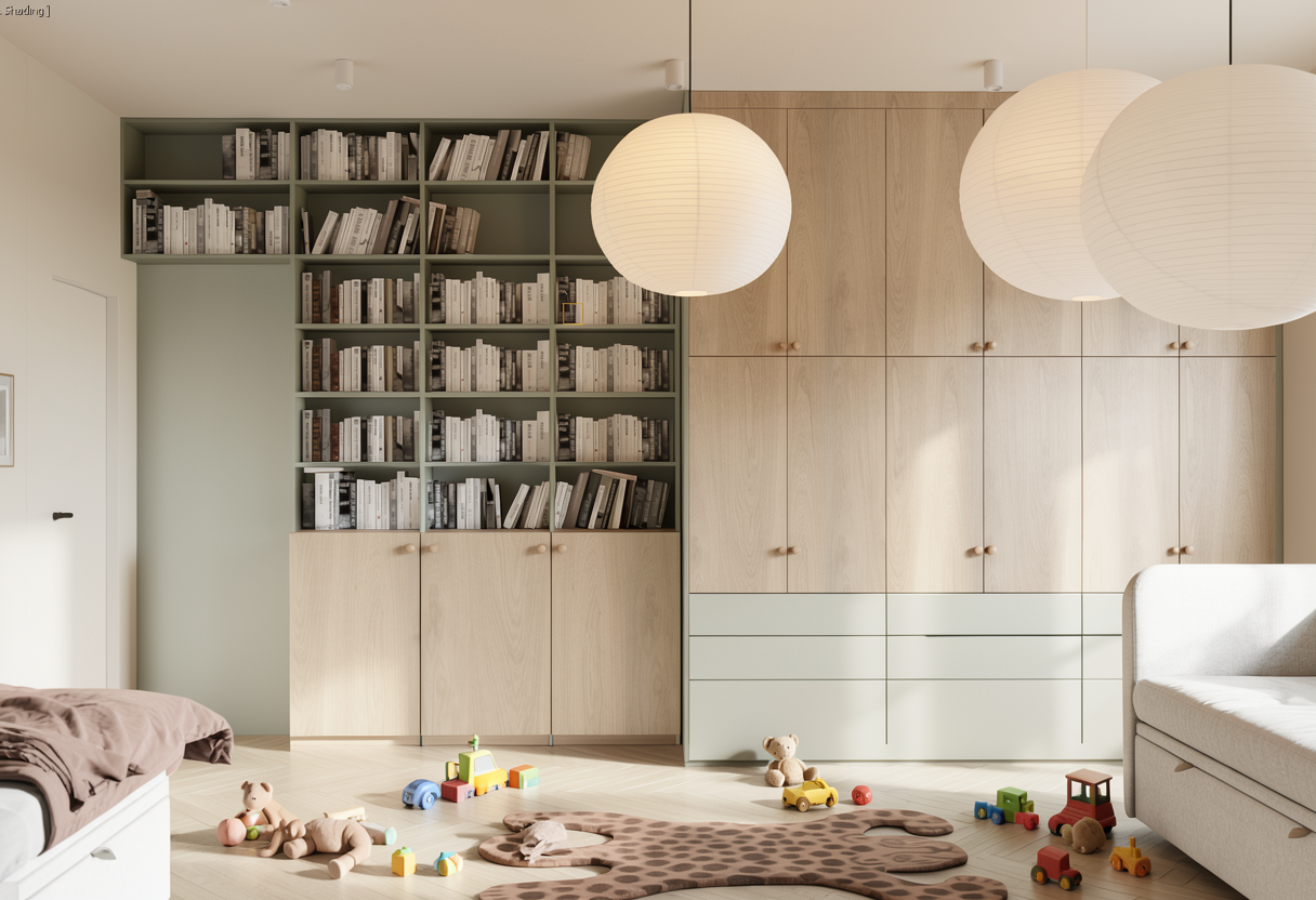 create a calm photorealistic render with soft gently diffused daylight as the primary light source lighting should feel natural even and soothing with no harsh shadows no strong contrast and no dramatic or cinematic effects daylight enters the space indirectly and is softly scattered creating smooth light transitions and subtle shadowing global illumination should be clean and balanced enhancing spatial depth without overexposure the wardrobe is finished in matte wood texture the surface should appear smooth non reflective with soft light absorption and a refined contemporary finish the handles are wooden round knobs natural wood tone matte with realistic material response the ceiling is finished in a soft light beige color matte with even light distribution and no visible hotspots or light banding the pendant lamps are paper shade lamps emitting warm neutral softly diffused light light output should be gentle and complementary to daylight not dominant no glare no sharp light edges no visible hard shadows add children s toys on the floor natural casual placement as if gently left behind realistic scale and proportions neutral or soft colors avoiding overly saturated or flashy tones toys should integrate naturally into the scene without clutter or visual noise enhance render quality through clean global illumination soft contact shadows subtle ambient occlusion natural color balance avoid stylization exaggeration or artificial effects the final result should feel bright soft lived in and natural resembling a high end daylight interior visualization with a calm welcoming atmosphere
