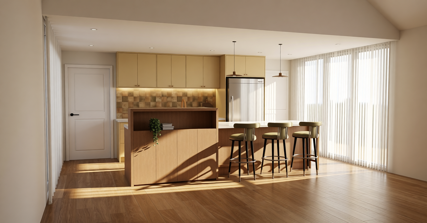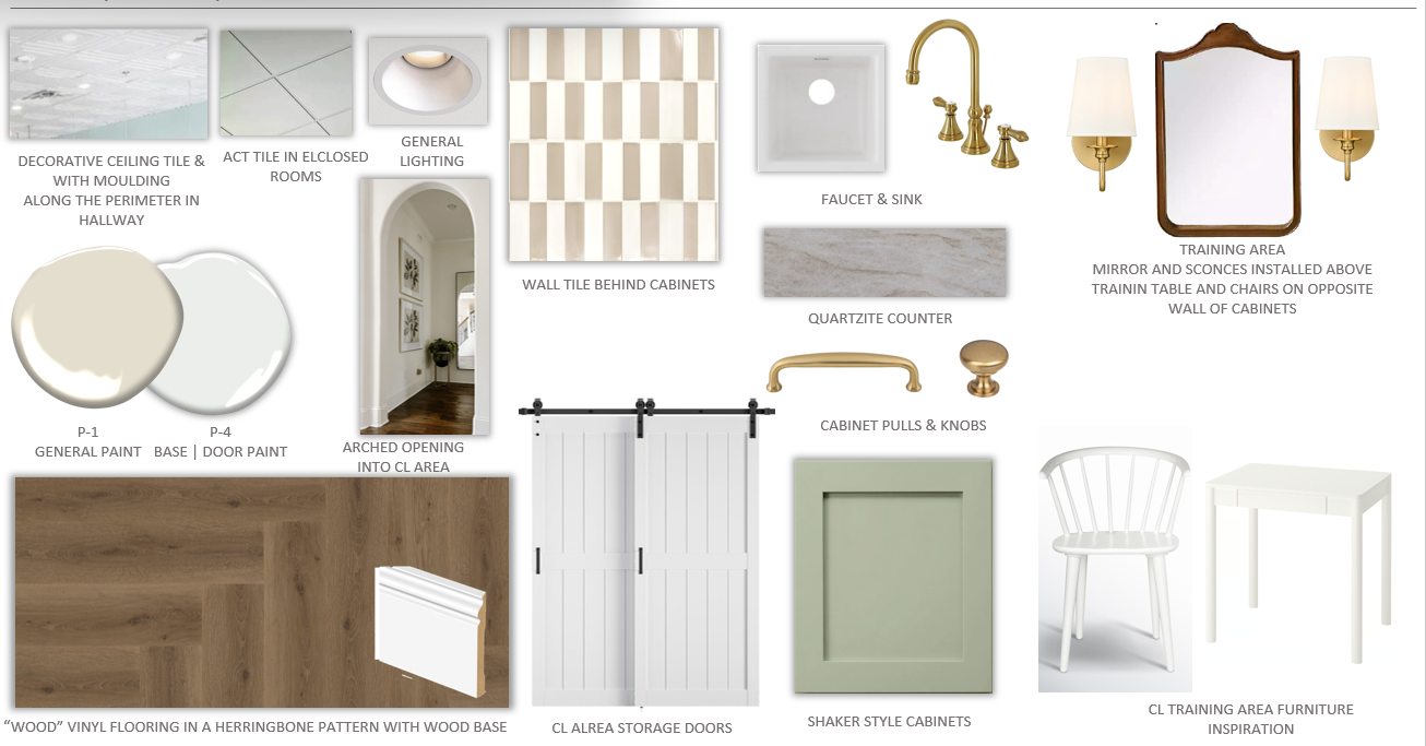 create a beautifully rendered interior space with the following elements install decorative ceiling tiles and molding along the hallway perimeter in a soft white utilize act tiles with subtle embossing for enclosed rooms enhanced by warm recessed lighting the walls behind the cabinets feature a cream and beige checkerboard tile pattern add a vintage brass faucet and fixtures above a white porcelain sink the counter is a natural quartzite with gentle earth tones create movement with herringbone patterned wood vinyl flooring paired with a classic wood base doors are light grey with a sleek black handle cabinets are painted in a soft sage green with intricate detailing incorporate brass cabinet pulls and knobs the training area features minimalist white furniture illuminated by warm brass sconces and complemented by a vintage style mirror overall atmosphere warm inviting and elegant with a blend of modern and classic aesthetics