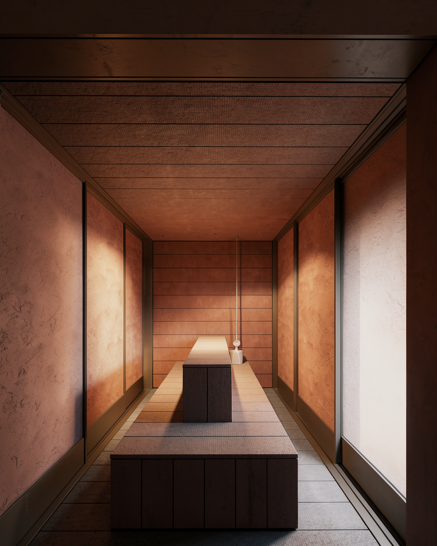 minimalist atmospheric sauna that leans into a earthy aesthetic the space is defined by its long monolithic burnt timber central bench and central wall and floor side walls panels clad in textured terracotta hued plaster